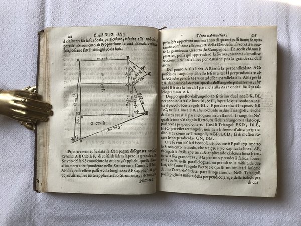 In-4. (8), 250 [i.e. 252] pagine. Con numerose figure nel testo e 4 c. di tav. fuori testo ripiegate più volte. Legatura coeva in tutta pelle, titolo in oro al dorso e piccoli fregi al centro delle caselle, 4 nervature. Carattere romano, un poco di corsivo. Bella vignetta allegorica al frontespizio, un capolettera ornato, una testatina e un finalino. Marginalia antiche e note più recenti a matita. Profilo caricaturale di uomo disegnato a matita al recto della carta di guardia disopra. Strappi alle prime 3 c. di tav., uno strappetto al margine bianco di I4. Generalmente una copia molto pulita, qualche fascicolo con arrossature. Piccoli fori di tarlo ai margini bianchi delle prime due ed ultime tre carte. Sguardie e contropiatti con numerosi fori e gallerie di tarlo lungo le estremità. Qualche tarlatura anche ai piatti e alle cerniere, cuffie ed angoli con mancanze. Una buona copia.