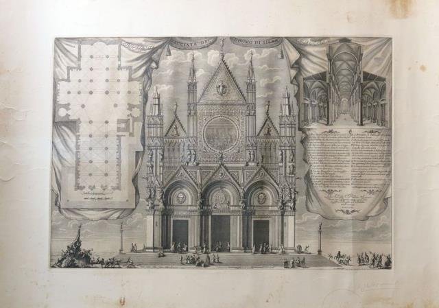 Lelius Cosatti, Patricius Senensis / Maximilianus Limpach, Roma, 1719. Incisione in rame all'acquaforte, cm 49 x 71,5 (alla lastra) più ampissimi margini. Esemplare in tiratura del XX secolo da matrice di origine, finemente incisa e con presente la battuta della lastra, stampata su buona carta pesante. La pianta e la facciata del Duomo di Siena sono accompagnate da ricca legenda (fino alla lettera V) con l'indicazione precisa di ogni statua, simbolo e ornamento apposto allo splendido edificio. Alcune macchie ai margini e al verso, pulito l'inciso, buono lo stato di conservazione.