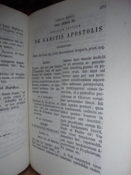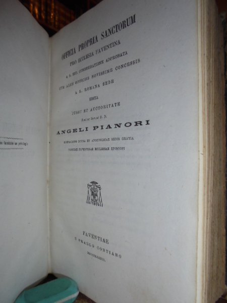 .a S. Rit. congregatione adprobata cum aliis officiis novissime concessis a S. Romana Sede edita Jussu et Auctoritate Ill.mi ac Rev.mi D. D. ANGELI, PIANORI miseratione divina et apostolicae sedis gratia sanctae Faventinae Ecclesiae Episcopi. Faventinae, E Praelo Contiano, MDCCCLXXXIII. In - 8°, m. pelle, titolo in oro sul dorso. 578 pp., (36) pp. Solida legatura con segni del tempo, ma ben conservato.