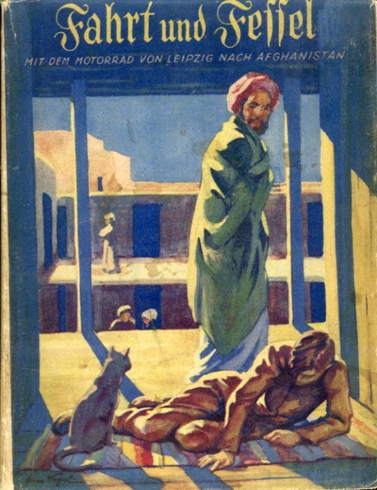 In-8°, pp. 280, legatura editoriale t. tela gialla con titolo e vignetta con uomo orientale con turbante in rosso. Sovraccoperta figurata a colori. 50 illustrazioni fotografiche f.t. Fioriture, alcune piccole mende alla brossura. Buona copia nell'insieme. Prima edizione di questo resoconto di viaggio in motocicletta da Lipsia all'Afghanistan compiuto dal noto geografo austriaco (Fulnek, 1894-Klosterneuburg, 1975).