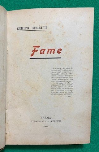 In 8°; 199, (1) pp. e una velina con l'errata-corrige. Legatura in mezza tela rossa con filetti, autore e titolo in oro al dorso. Qualche traccia del tempo alla legatura, all'interno in buone condizioni di conservazione. Dedica autografa dell'autore alla prima carta bianca datata "Reggio-Emilia 18 - XI - 910". Prima assai rara edizione di questo scritto del noto poeta, scrittore e bibliotecario italiano, Gerelli Enrico. L'autore fu bibliotecario alla Biblioteca Panizzi di Reggio-Emilia e a lui si deve, nel 1929, la risistemazione, esposta poi nel catalogazione ancora oggi seguita dalla Biblioteca Panizzi degli incunabuli, delle edizioni aldine, degli incunabuli miniati e dei manoscritti miniati in essa contenuti.