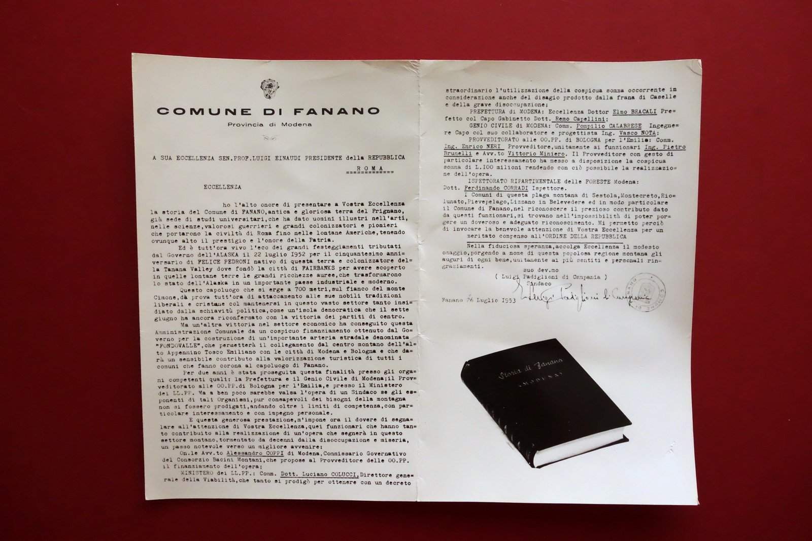 Fanano Modena Lettera Fotografia a Luigi Einaudi Storia di Fanano Pedrocchi 1953