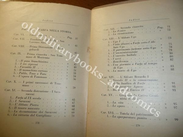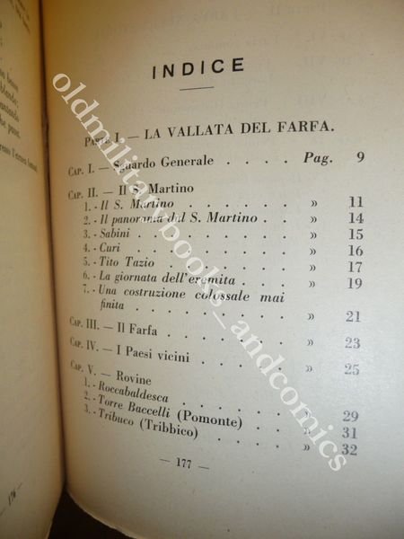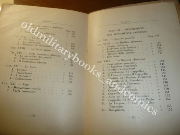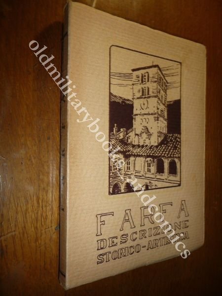 DESCRIZIONE: Azienda Grafica Italiana S. A. Roma, 1932 br. ed. ill. con alette, pp. 182, (2) a fogli parzialmente chiusi, con una cartina di Farfa e la Sabina all'antiporta e numerose tavole illustrate in b/n a p.p. f.t. in 16°. La vallata del Farfa; Farfa nella storia; Descrizione dei monumenti farfensi. CONDIZIONI: Ottime due piccole pieghette al retro di cop. PESO / WEIGHT: 211 gr. without package