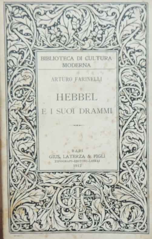 Arturo Farinelli, Hebbel e i suoi drammi. (Lezioni tenute all’Università di Torino), Gius. Laterza e Figli Tipografi-Editori-Librai, Bari 1912, pp. IX, 276, cm 21, br. ed. Collana Biblioteca di cultura moderna, n. 62. Minime tracce d’uso alla brossura, fioriture a brossura e tagli, carta uniformemente brunita, per il resto buona copia.