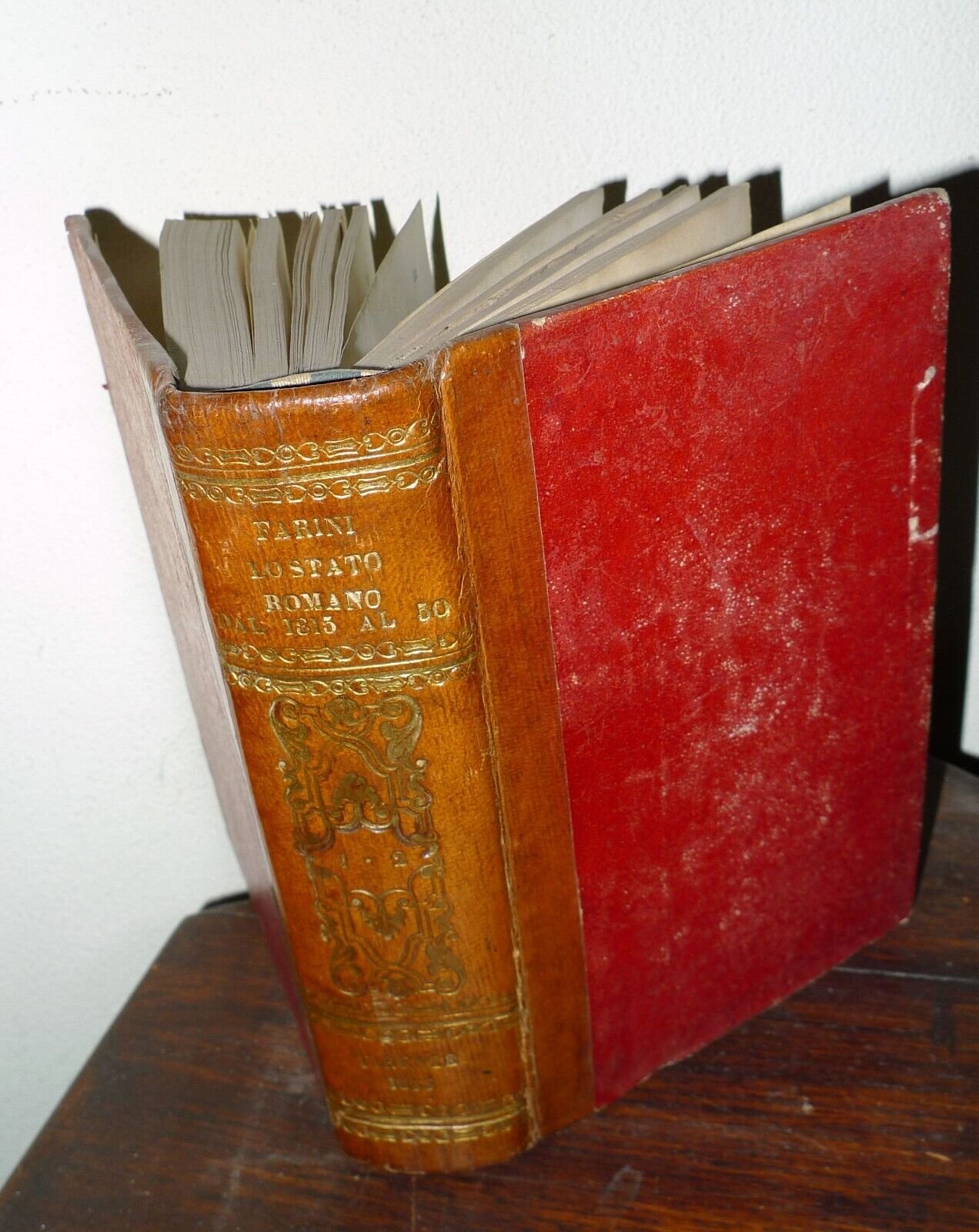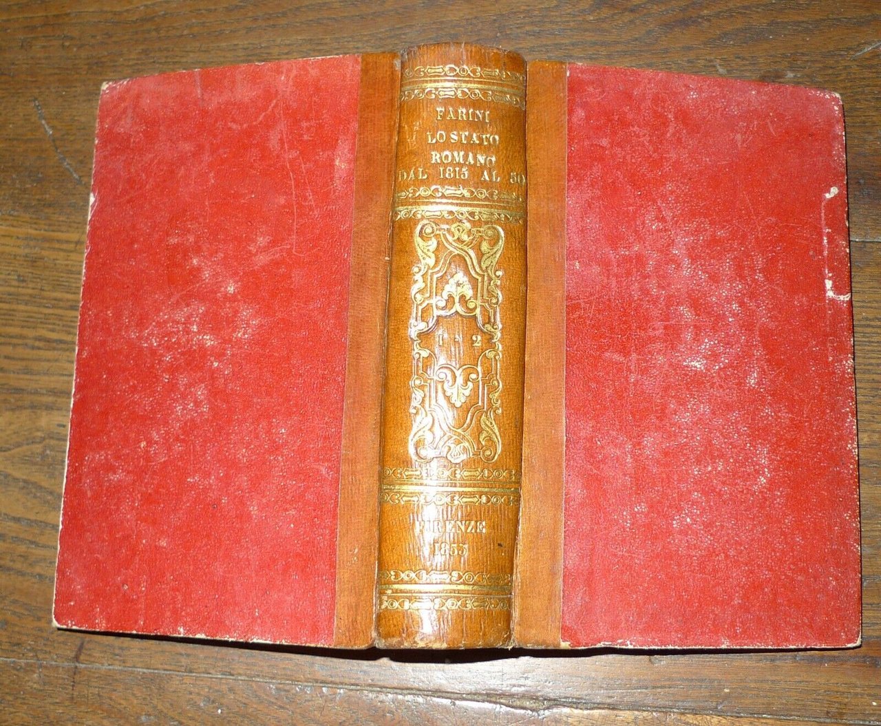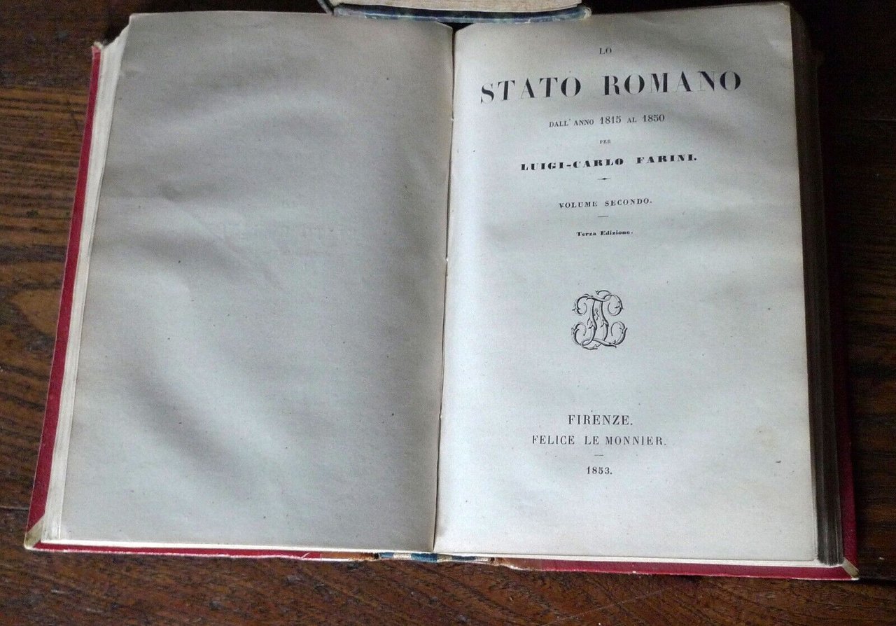 LO STATO ROMANODALL'ANNO 1815 AL 1850PER LUIGI-CARLO FARINI.VOLUME PRIMO.VOLUME SECONDO.[2 VOLUMI, DI 4, RILEGATI IN UN UNICO TOMO].FIRENZE, FELICE LE MONNIER, 1853,TERZA EDIZIONE,copertina rigida, rilegatura coeva in mezza pelle,18,5x12 cm., pp.VIII-380; 397,peso: g.650