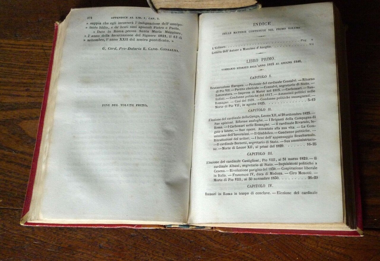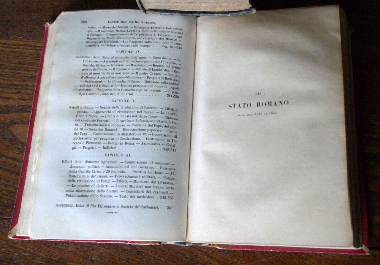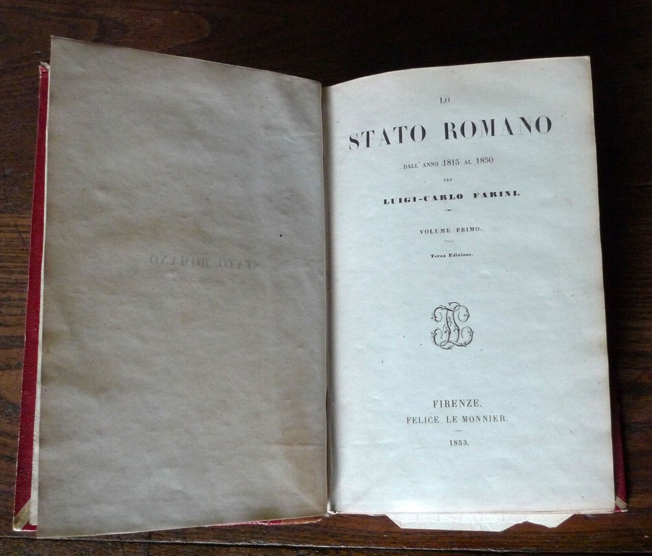 LO STATO ROMANODALL'ANNO 1815 AL 1850PER LUIGI-CARLO FARINI.VOLUME PRIMO.VOLUME SECONDO.[2 VOLUMI, DI 4, RILEGATI IN UN UNICO TOMO].FIRENZE, FELICE LE MONNIER, 1853,TERZA EDIZIONE,copertina rigida, rilegatura coeva in mezza pelle,18,5x12 cm., pp.VIII-380; 397,peso: g.650