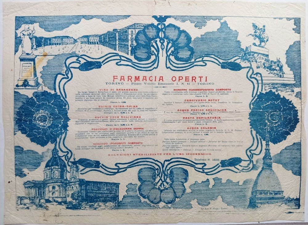 >Litografia (mm 240 x 330), inchiostro blu e rosso su velina. Foglio illustrativo pubblicitario della Farmacia Operti di Torino, sita in Piazza Vittorio Emanuele I, N° 11, che riporta, nel centro, un elenco di alcuni medicamenti prodotti dalla farmacia, come il Vino di Rabarbaro, l'Elixir China China, l'Elixir Coca Boliviana, la Pasta Depilatoria e l'Acqua di Colonia, con indicazioni terapeutiche e posologie, oltre ai relativi prezzi. Tutto intorno, cornice floreale in stile Liberty e quattro scorci di Torino (Piazza Vittorio, Superga, la Mole Antonelliana e la statua equestre con Carlo Alberto. In basso a destra indicazioni tipografiche "Tip. Lit. P. Giani - Torino". Piccola macchia gialla sul margine a sinistra. Esemplare ben conservato.