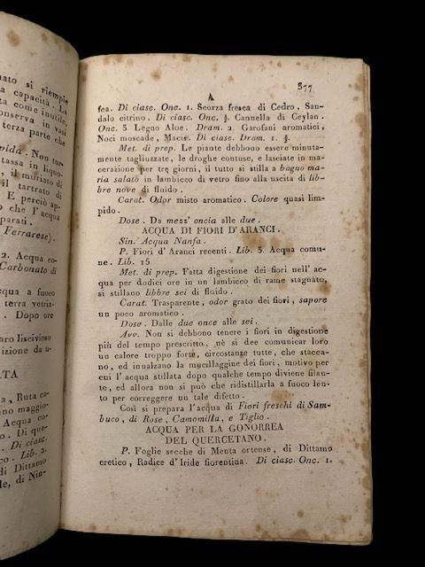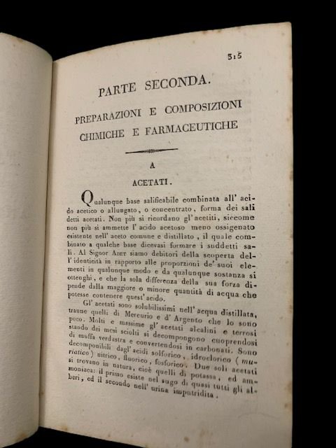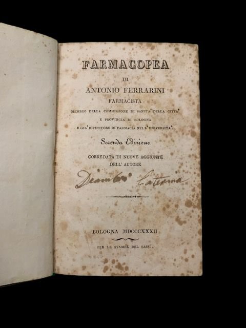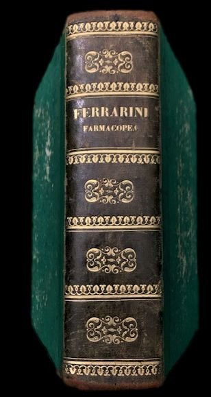 In 4°; 833, (3) pp. Legatura coeva in mezza-pelle verde con titolo, autore e ricchi fregi in oro al dorso. Piatti foderati con carta marmorizzata coeva ai piatti. Alcune macchioline di foxing come caratteristico di tutti gli esemplari a causa della qualità della carta utilizzata. Antica firma d'appartenenza privata al frontespizio. Seconda edizione, notevolmente aumentata (più di 300 pagine) rispetto alla prima edizione del 1825, di questa farmacopea bolognese, opera del noto farmacista e ripetitore di Chimica farmaceutica all'Università di Bologna, Antonio Ferrarini che fu fondatore di diverse farmacie pubbliche e private bolognesi. Ferrarini fu il più influente farmacista bolognese del XIX° secolo. L'opera descrive la composizione medicinali ed erboristiche, i metodi di preparazione e di analisi e quanto altro serva a identificare e standardizzare sul piano qualitativo e quantitativo i preparati farmaceutici. L'opera descrive così centinaia di ricette di farmacopea basate sulle piante, insetti, veleni ecc. Opera non comune, in buone condizioni di conservazione e in bella legatura coeva.