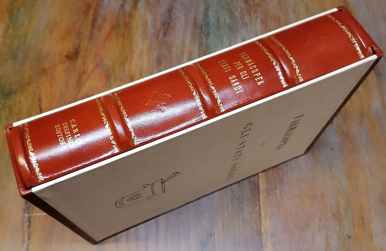 (Sardegna; Farmacia; Farmacologia; Farmacopee italiane pre-unitarie) In 8°, bella legatura editoriale in piena pelle marrone, dorso a 5 nervi con titoli e filetti ornati dorati, al piatto anteriore disegno ornamentale impresso in oro entro doppia cornice a motivo vegetale a secco e dorata, marca tipografica entro cornice a secco al piatto posteriore, tagli martellati, custodia editoriale in pelle e cartone illustrato ai piatti, cofanetto in cartone con riprodotto il frontespizio dell'edizione originale, pp. (10),XXIII,(1),374,(2). Ristampa anastatica su carta vergata dell'edizione del 1853 (Torino presso la Stamperia Reale) redatta dalla Commissione del Consiglio Superiore di Sanità di cui facevano parte i Professori Cantù, Berruti, Abbene, Demarchi, Borsarelli, Schiapparelli e Trombotto. Premessa di Leonardo Colapinto, Libero Docente di Storia della Farmacia nell'Università "La Sapienza" di Roma. Perfetto stato di conservazione.