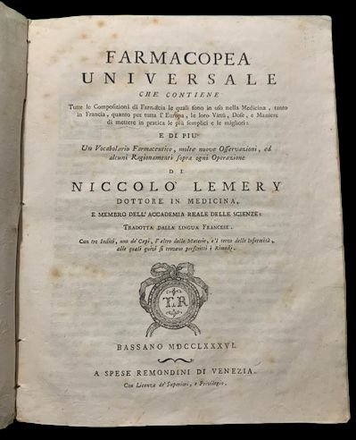 In quarto grande; XII, 447, (3 b.) pp. Legatura coeva in piena pergamena con titolo e autore impressi in oro al dorso. Dorso a 5 nervi. Testatine ed iniziali xilografiche. Esemplare in ottime condizioni di conservazione, raro a reperirsi in queste condizioni, specialmente trattandosi di una farmacopea, opera solitamente usata in ambienti non favorevoli alla conservazione dei libri. Fra le meno comuni fra le edizioni italiane, stampata a Bassano da Remondini, della più celebre farmacopea del settecento, opera del celeberrimo medico e chimico francese, Nicolas Lemery (Rouen, 17 novembre 1645 Parigi, 19 giugno 1715). Nicolas fu il quinto figlio del Procuratore del Parlamento di Normandia. A 15 anni entrò come apprendista nella farmacia dello zio materno Pierre Duchemin a Rouen. Dopo sei anni di studi farmaceutici presso lo zio si trasferì a Parigi come apprendista di Christopher Glaser (1628-1670), celeberrimo farmacista alla corte di Luigi XIV. Nel 1668 si trasferì a Montpellier dove iniziò anche a dar lezioni di farmacia. Qui vi rimase fino al 1671. Lasciata a Montpellier, ritornò a Parigi per entrare nello staff del laboratorio di Bernardin Martin (1629-1703), farmacista di Luigi II di Borbone-Condé e inseritissimo negli ambienti nobiliari pargini. E proprio seguendo Martin che Lemery iniziò a farsi conoscere fra la buona società parigina. Messosi in proprio, aprì una farmacia che ben presto, ottenne notevolissimo successo, continuando, al contempo, a tenere lezioni pubbliche e private. Nel 1683, essendo Nicolas di religione protestante, la sua farmacia venne chiusa a causa delle guerre religiose che colpirono la Francia. Lemery non si perse danimo e iscrittosi allUniversità di Caen si laureò in medicina. Nel 1685 la revoca delleditto di Nantes che lasciava libertà di culto ai protestanti, costrinse numerosissimi di questi a lasciare la Francia. Lemery, scappò in Inghilterra ma dopo un anno si convertì al cattolicesimo e tornò in Francia. Alla fine del 1686 aveva già riaperto la sua farmacia ed iniziò, nuovamente, a tenere le sue lezioni. Nel 1699 venne accolto nellAccademia delle scienze francese. Abile didatta portò la chimica verso la sua moderna forma, allontanandola dallalchimia. Loriginalità del suo pensiero risiede nel suo modello corpuscolare e meccanicistico degli acidi e delle basi. Gli acidi hanno parti appuntite che si attaccano ai pori delle basi, portando alla neutralizzazione di entrambe le specie mediante la formazione di un sale. Sviluppando questo modello corpuscolare, si avvicina implicitamente alla nozione di affinità tra due corpi. Fiducioso nella prima filosofia naturale declinata nella scienza, cioè nella possibilità di concepire una struttura della materia con i soli mezzi della chimica (senza affidarsi agli Antichi), purifica la farmacopea, chiarendo la chimica che sostiene essere una scienza limitandosi a esporre senza deviazioni, fatti ed esperimenti. Proprio per la base scientifica delle sue opere, Lemery ebbe enorme successo nellepoca dei lumi. Edizione assai poco comune stampata a Bassano da Remondini. Rif. Bibl.: ICCU IT\ICCU\VIAE\003414.