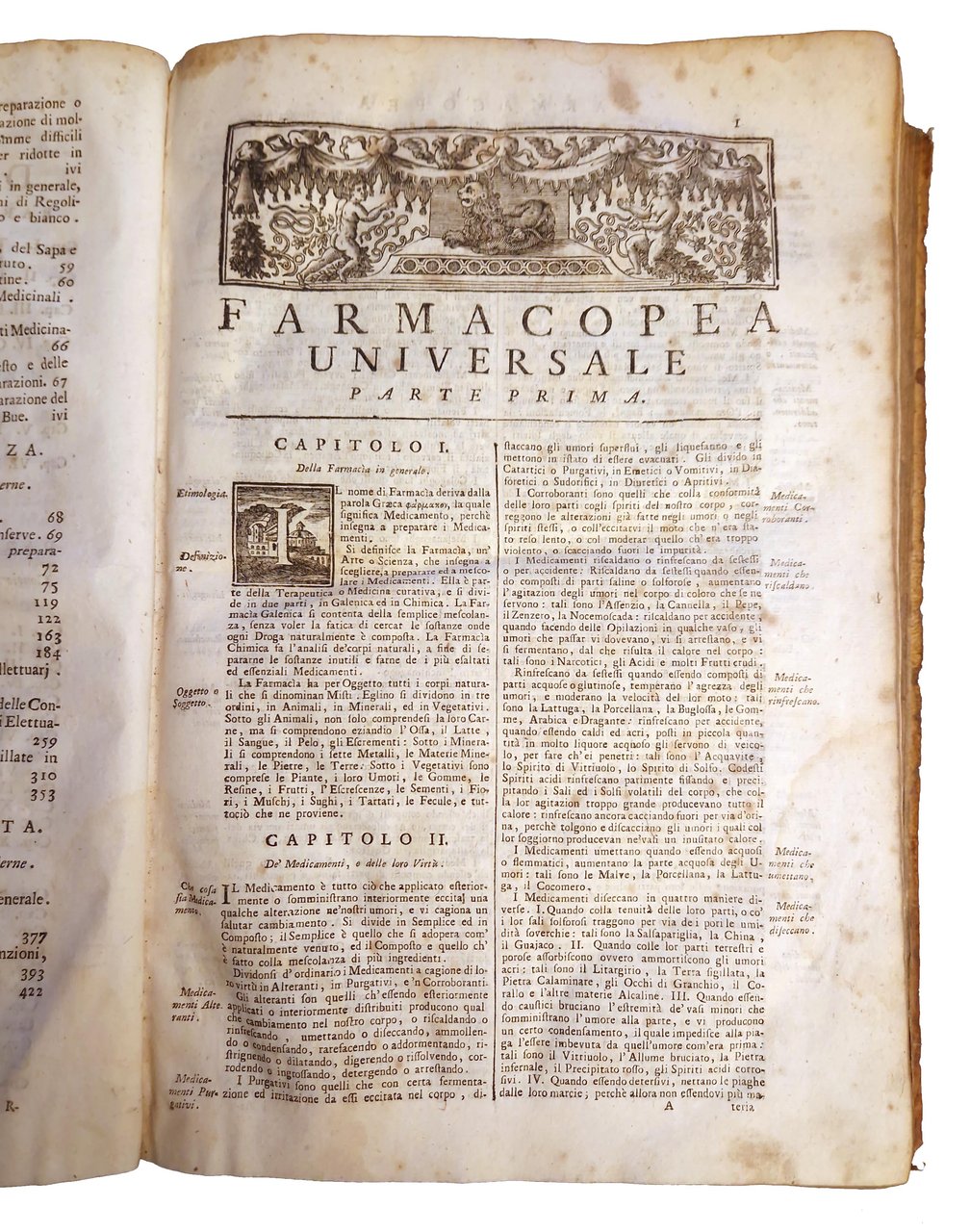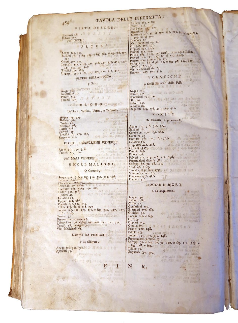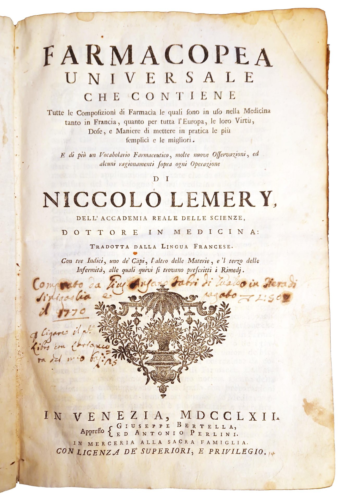 Farmacopea universale che contiene tutte le composizioni di farmacia le quali sono in uso nella medicina tanto in Francia, quanto per tutta l'Europa, le loro virtù, dose, e maniere di mettere in pratica le più semplici e le migliori. E di più un vocabolario farmaceutico, molte nuove osservazioni, ed alcuni ragionamenti sopra ogni operazione di Niccolò Lemery, […] tradotta dalla lingua francese. Con tre indici, uno de' capi, l'altro delle materie, e 'l terzo delle infermità, alle quali quivi si trovano prescritti i rimedj.