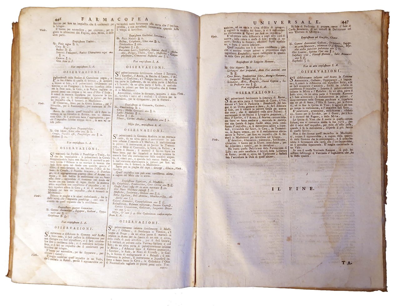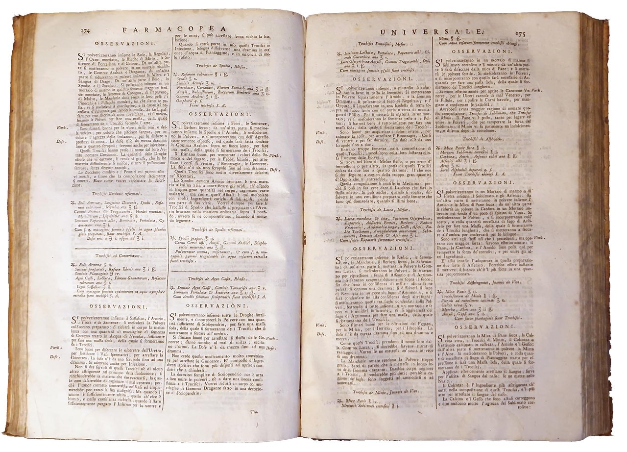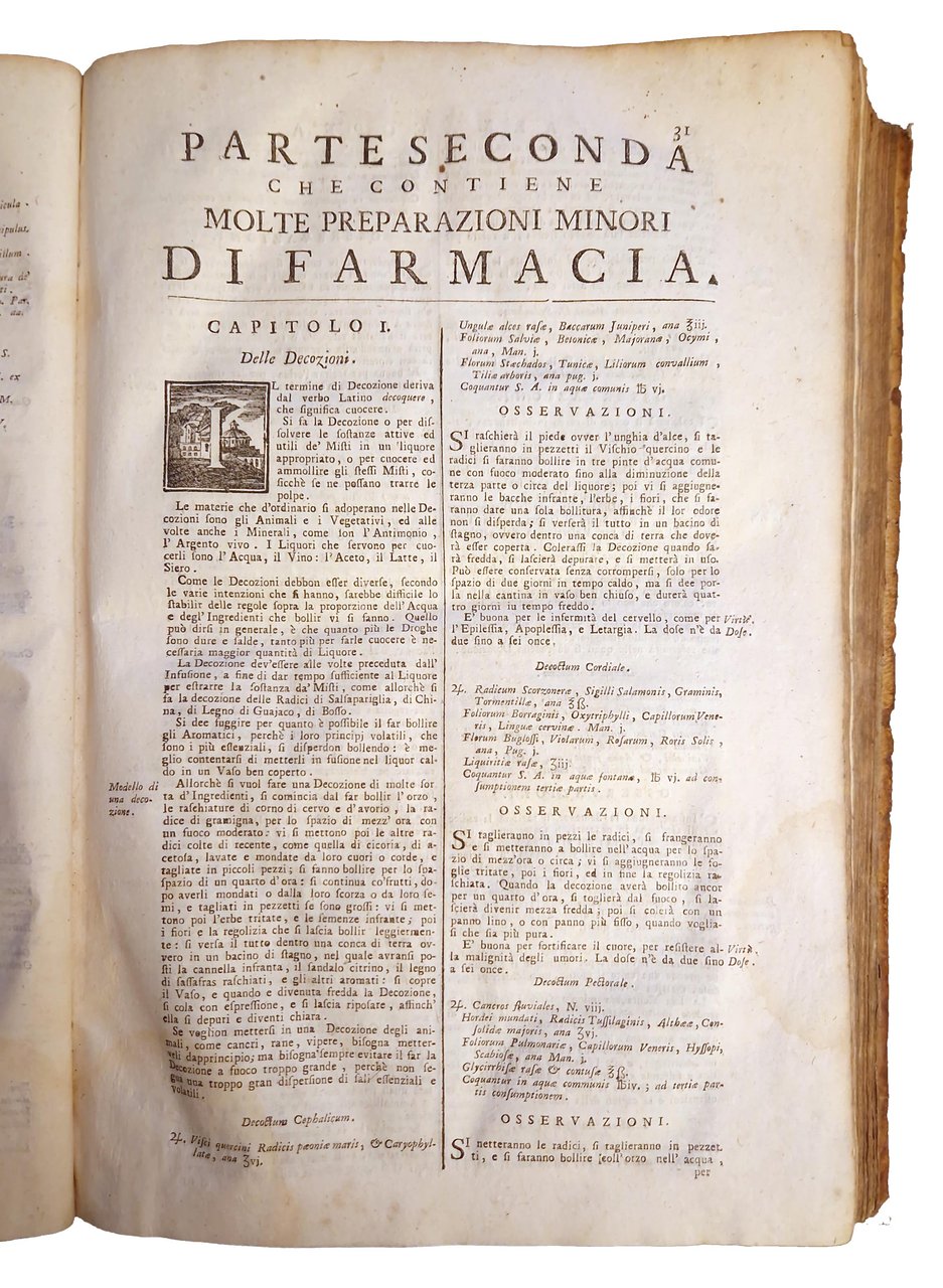 in-folio, 334x220 mm, leg. coeva in piena pergamena, con nome dell'autore al dorso; pp. [12], 484. Occhietto con titolo "Farmacopea universale di Niccolò Lemery". Iniz. e vignette xil. Poco comune edizione veneziana di grande formato di uno dei più celebri repertori della farmacopea a cura del Lemery, ricca di ricette, autentica pietra miliare nel campo delle preparazioni medicinali del Settecento; meravigliosa opera di farmacia che influenzerà la scienza farmacologica europea per oltre un secolo. Nicolas Lémery (Rouen, 17 novembre 1645 – Parigi, 19 giugno 1715) è stato un chimico e medico francese. Fu autore di diversi libri e trattati che contribuirono alla diffusione della chimica, facendola uscire dalla visione di Paracelso, interpretando le reazioni chimiche con teorie corpuscolari. Prov.: Iscrizione manoscritta al frontespizio ("Comprato da Gius. Ansano Fabri di Gualo in Fiera di Sinigalia e pagato … il 1770 … ligare il p. libro con cartancora del mio …"). Etichetta di libreria antiquaria incollata in basso al contropiatto posteriore e scritta a matita (acquistato il 21-6-1972 Libreria Antiquaria Tonini - Ravenna). Rif.: IT\ICCU\UM1E\005874 (7 copie nelle Biblioteche Italiane). OCLC, 19387514. Cond.: Segni d'uso alla legatura (presenza di macchie, piccole mancanze al dorso e abrasioni agli angoli). Carte pulite, ma con presenza di alcune fioriture ed aloni marginali di umido (in particolare verso la fine dell'opera). Esemplare nel complesso in buone condizioni.