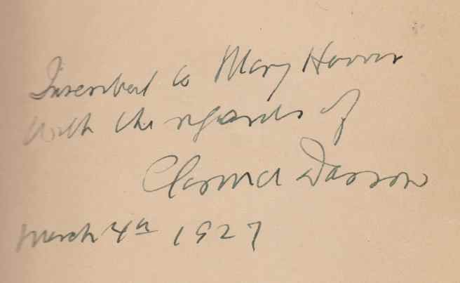 Boards with light rubbing to extremities. Gilt lettering and gilt spine lettering faded. Hinges started. One page with rough paper and affecting the contents - apparently from an attempt to separate two pages that were stuck together. ; Darrow's autobiographical novel, a fictionalized account of his boyhood. Presentation copy: Inscribed by the author on front free endpaper: "Inscribed to Mary Hoover with the regards of Clarence Darrow, March 4th 1927". Additionally laid in is Ms. Hoover's contemporaneous account of a talk given by Darrow at the Negro Industrial Schho, Daphne, Alabama on February 10, 1927: "I can't help you, you will have to help yourselves, but I advise always an attitude of defiance toward the white man who calls himself your friend. How has he manifested this friendship? By hanging and burning you; by making you do his work and use his back door." In blue linen custom box; 12mo 7" - 7½" tall; 220, 2 pages