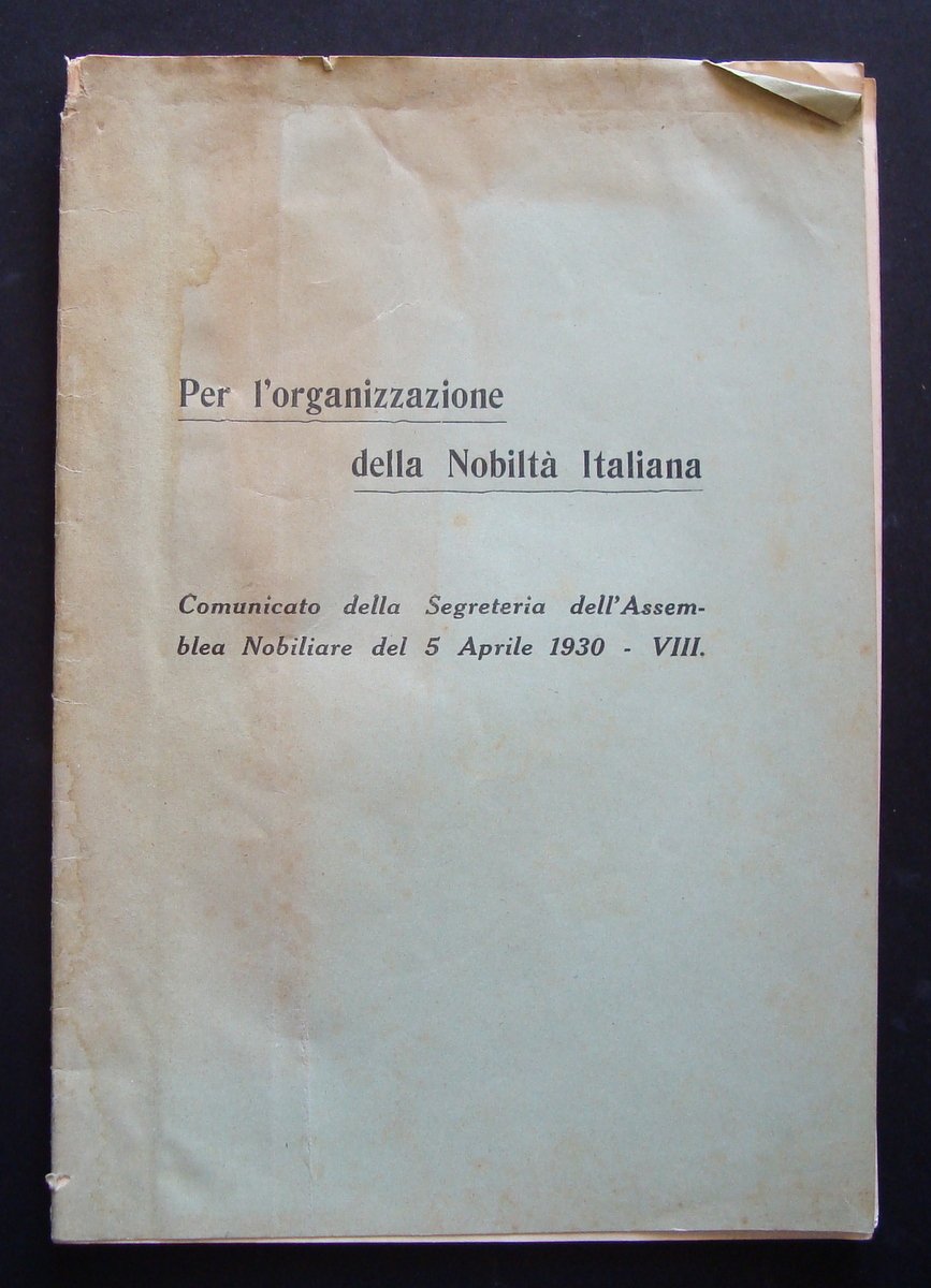 Fascicolo, PER L'ORGANIZZAZIONE DELLA NOBILTA' ITALIANA Comunicato della Segreteria dell'assemblea nobiliare del 5 Aprile 1930 - VIII Estratto dalla Rivista Araldica fascicolo di maggio 1930 VIII Senza note tipografiche, 1930-VIII, cm 24,5 x 17, brossura ed. Condizioni di conservazione. buono stato con leggere tracce d'uso e del tempo, tracce di macchiette e sporco per vecchia umidità; cuffia sup. con piccola mancanza; angolo sup. della br.ant.con leggero accenno di pieghetta OPEB.2918 BLU