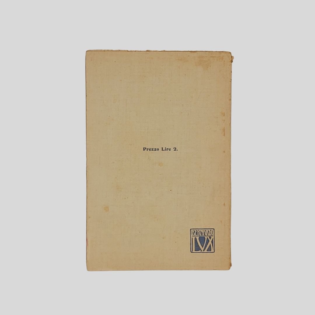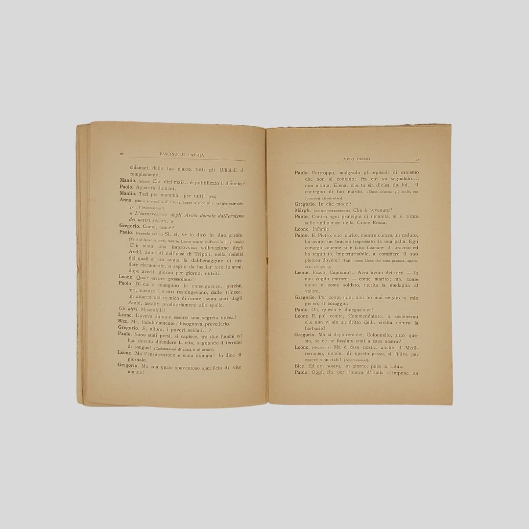 in-16° (cm 18,5), pp. 97. Insignfic. tracce d’uso alla copertina. L’azione si svolge in Piemonte fra il 1911 ed il 19123, quasi durante il primo semestre della Guerra italo-turca: i primi due atti a Torino, il terzo a Rivoli.