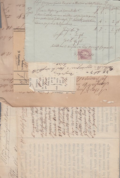 Fascicolo contentente alcuni conti due dei quali su foglietto con marca da bollo ed uno su foglio più grande (questo con più strappetti abbastanza rovinato), degli appunti manoscritti, ed un bel bando per la venditadi coatta beni immobiliari datato 1874 avente ad oggetto l'istanza di Modesto, figlio di Luigi Giuntini fabbro domiciliato a Pontedera contro i beni di Olinto del fu Carlo Fabbrichesi possidente domiciliato Montefoscoli. interessante la descrizione dei beni da vendersi ed i luoghi in cui questi erano.