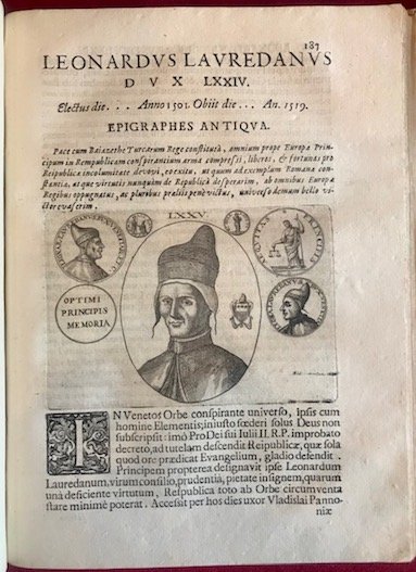 4to (cm. 25,7), 4 cc.nn., 360 pp. Con 109 magnifici ritratti dei Dogi incisi su rame (alcuni con accanto medaglie ed insegne araldiche). Frontespizio in rosso e nero. Capilettera e fregi xilografici n.t. Legatura coeva in pergamena rigida con piccoli nervi e titolo ms. al ds. Forellini di tarlo la margine superiore bianco delle ultime quattro carte, altrimenti esemplare assai fresco ed in ottimo stato di conservazione (privo - come parte delle copie - delle 12 carte finali di Indice). Cfr. Cicogna (n. 2261): ‘È delle migliori collezioni di Dogi Veneziani che dà anche notizia delle monete o medaglie ad essi spettanti’; Lozzi, 6085; Vinciana, 1041.