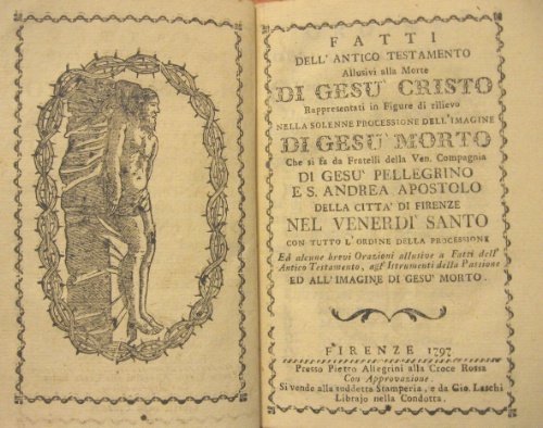 Fatti dell’Antico Testamento allusivi alla morte di Gesù Cristo. Rappresentati in Figure di rilievo nella solenne processione dell’imagine [sic] di Gesù morto Che si fa da Fratelli della Ven. Compagnia di Gesù Pellegrino e S. Andrea Apostolo della città di Firenze nel venerdì santo con tutto l’ordine della processione. Ed alcune brevi Orazioni allusive a Fatti dell’Antico Testamento, agl’Istrumenti della Passione ed all’imagine [sic] di Gesù morto.