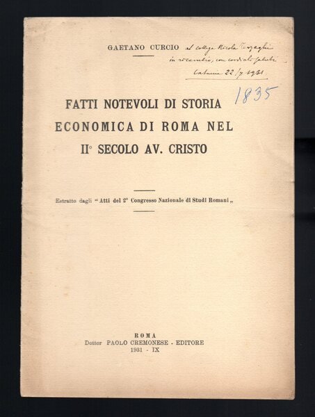 Opuscolo vintage. Estratto dagli "Atti del II Congresso Nazionale di Studi Romani" Dedica autografa dell'autore. Segno di biro in copertina. Ordinario segno del tempo. Usura da scaffale.