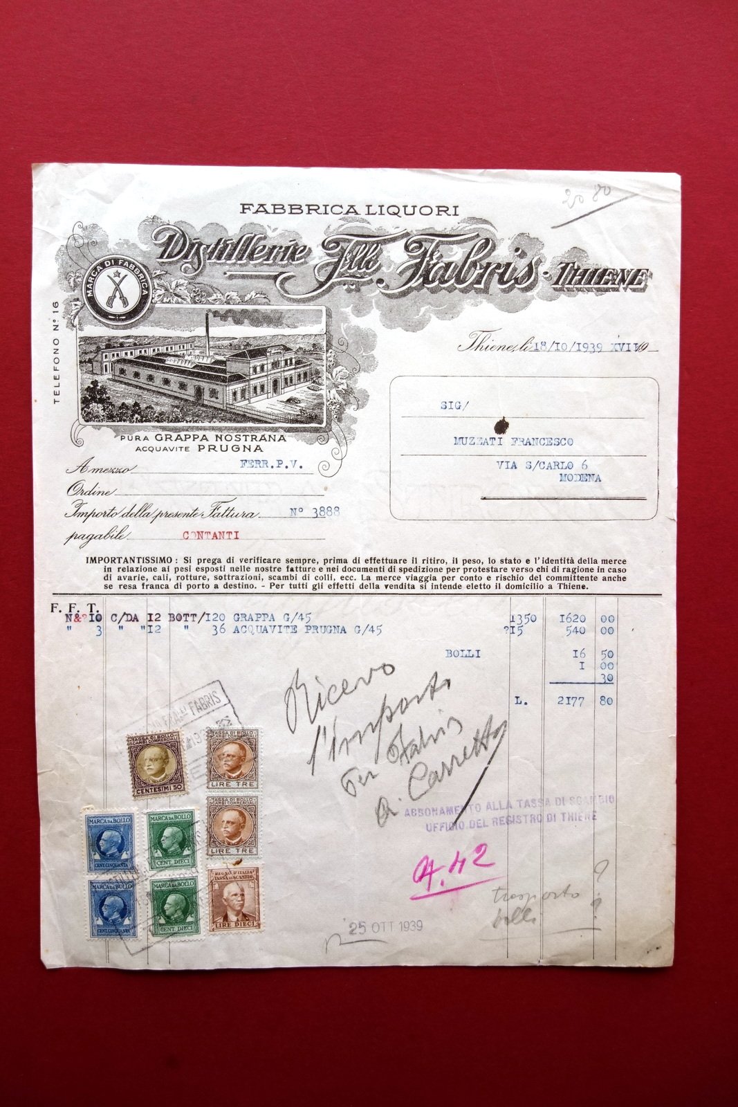 Fattura Fabbrica Liquori Distillerie F.lli Fabris Thiene Grappa Acquavite 1939