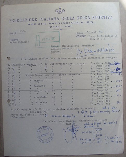 Fattura Federazione Italiana Pesca Sportiva Sezione Provinciale CAGLIARI 1963 (alla Ditta Fratelli Lorioli - medaglie)