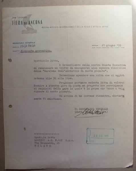 Fattura Fiera di ANCONA Mostra Mercato Internazionale Pesca 1955 (Ditta Fratelli Lorioli - medaglie)