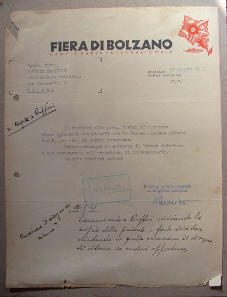 Fattura Fiera di BOLZANO Campionaria Internazionale 1955 (alla Ditta Fratelli Lorioli - medaglie)