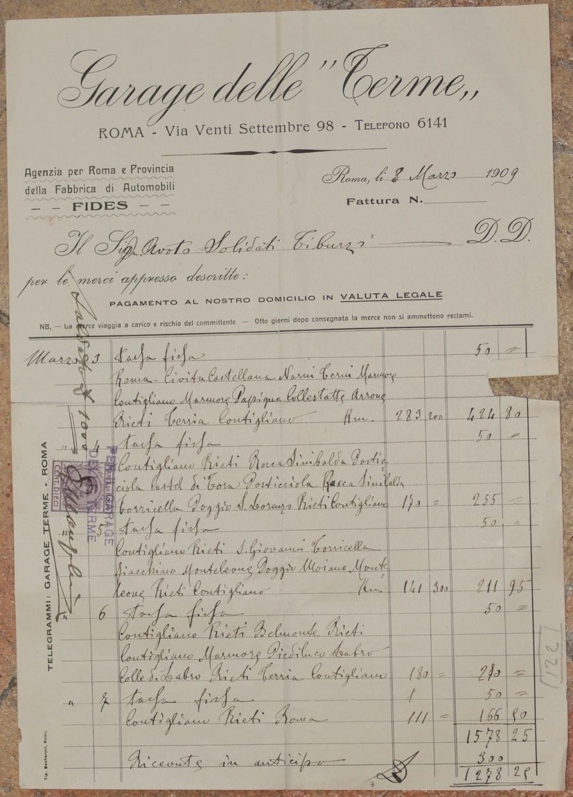 FATTURA GARAGE DELLE TERME ROMA LI 8 MARZO 1909