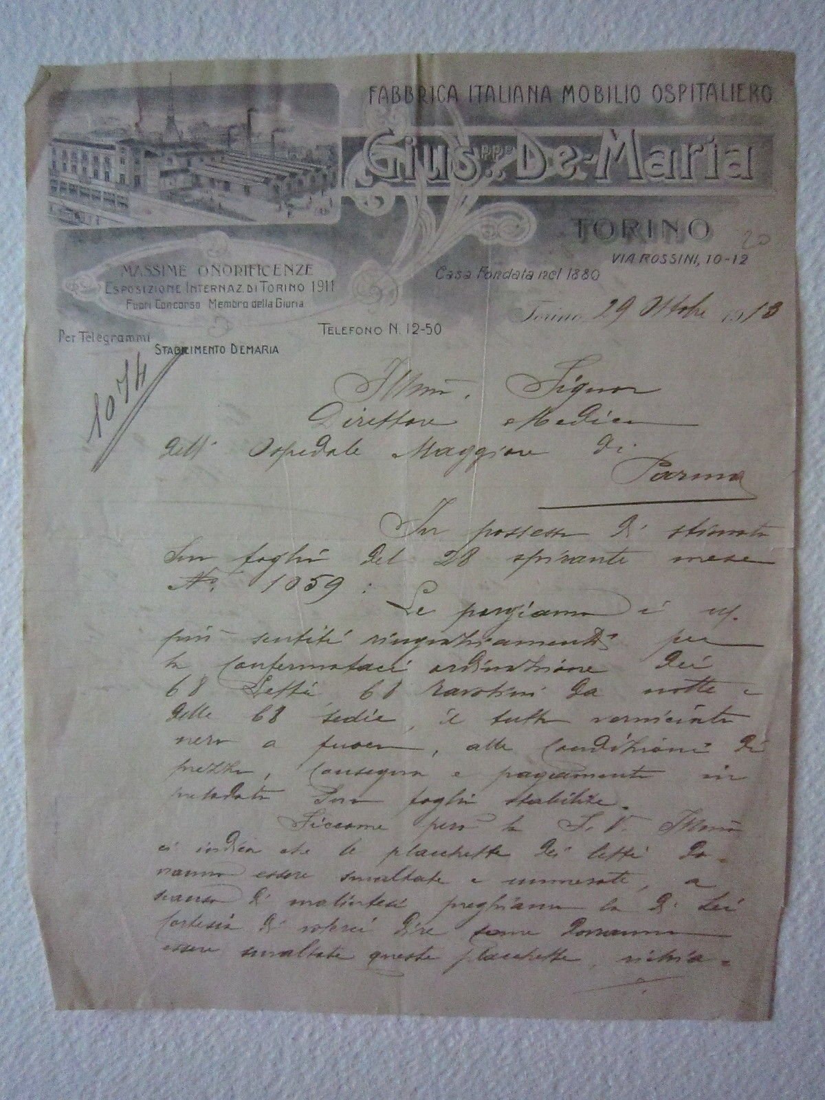 Fattura Gius De Maria Torino Mobilio Ospedaliero Ospedale Medicina Salute 1914