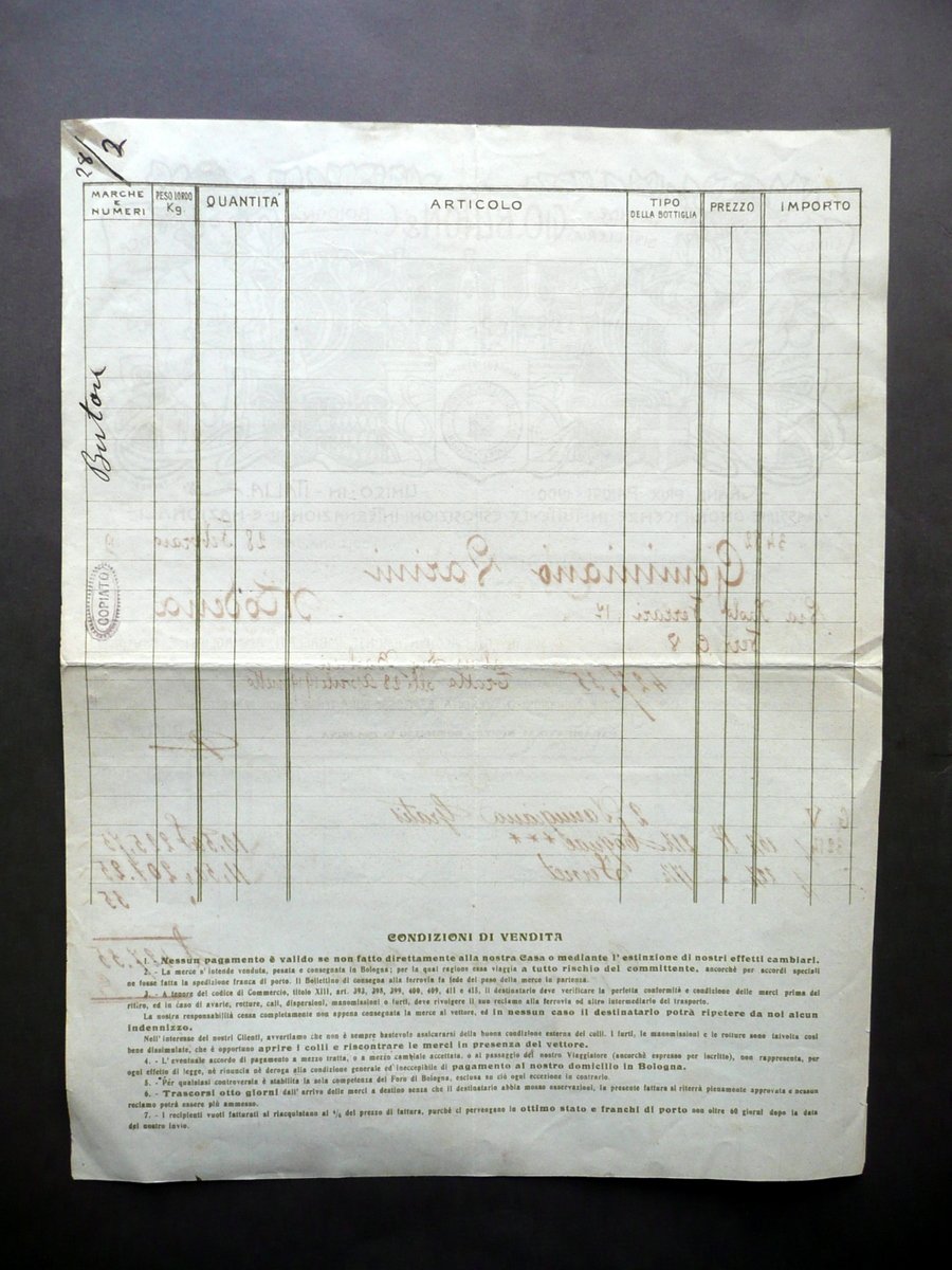 Fattura Grande Distilleria Gio. Buton Bologna 1919 Cognac Fernet Grafica