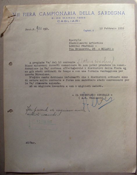 Fattura VII Fiera Campionaria della Sardegna - CAGLIARI 1955 (alla Ditta Fratelli Lorioli - medaglie)