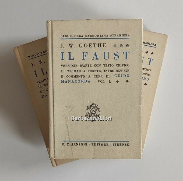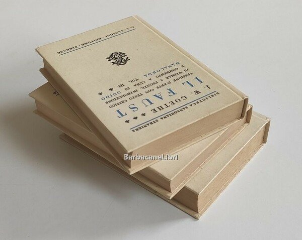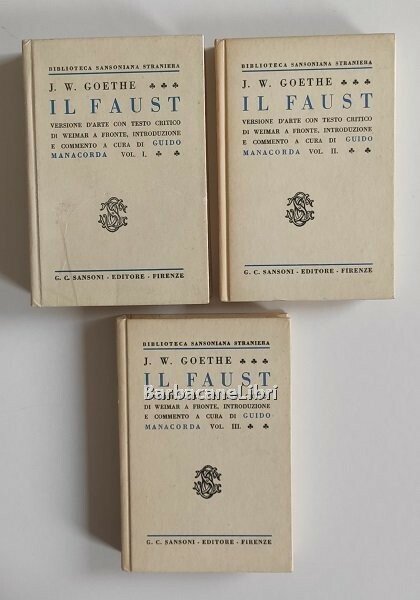 Stato di conservazione: OTTIMO, tagli ingialliti, minuscolo danno a margine della copertina del vol. I, per il resto in ordine. Collana: Biblioteca Sansoniana straniera. Versione d'arte con testo critico di Weimar a fronte, introduzione e commento a cura di Guido Manacorda. Voll. I e II prima edizione (1949), voll. III seconda edizione (1954). Testo in lingua originale tedesca con traduzione italiana a fronte