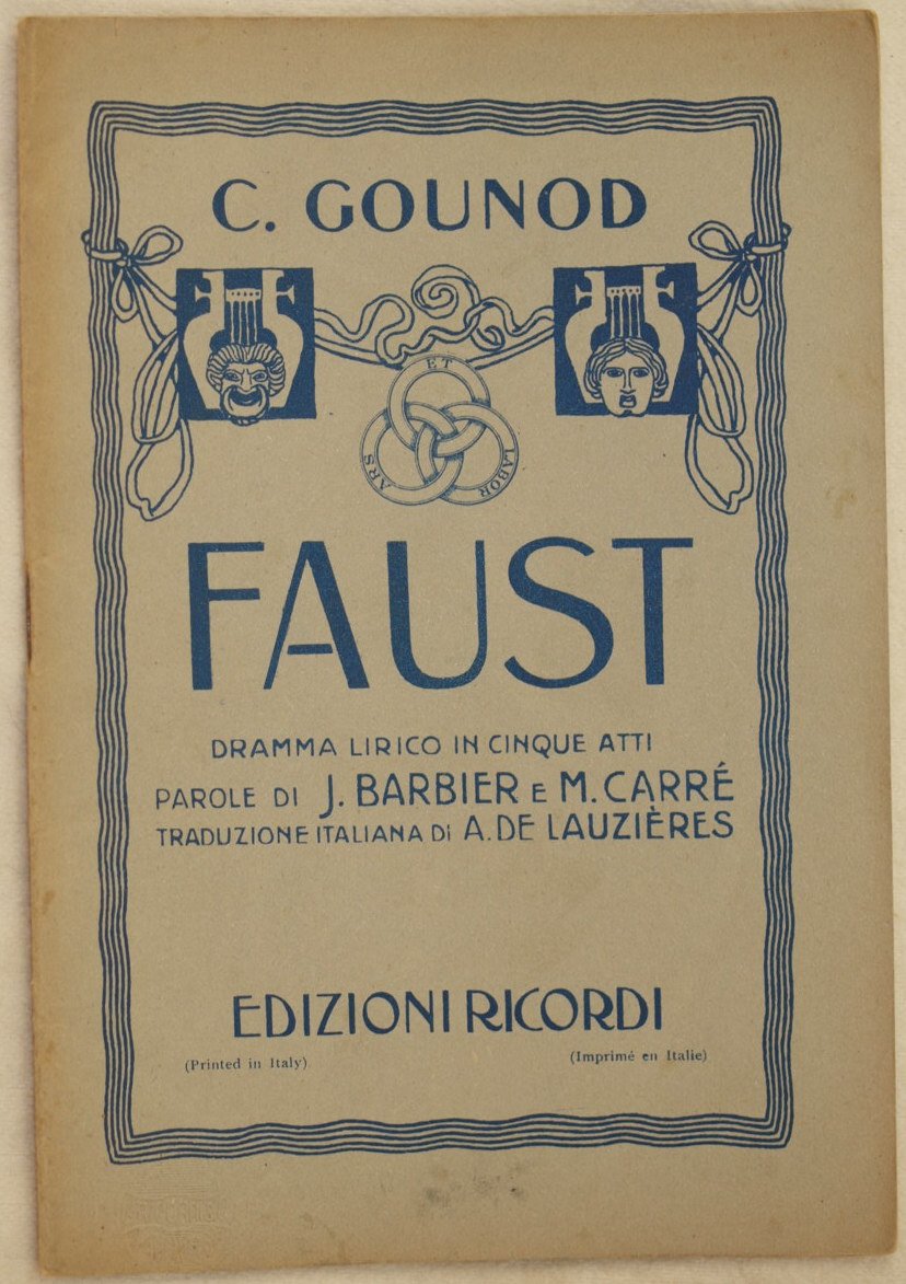 In 8. Dim. 20x13,5 cm. Pp. 32. Bel libretto d'opera del novembre 1938 dell'opera lirica in cinque atti "Faust" di Charles Gounod (1818-1893) su libretto di Jules Barbier e Michel Carrè.<BR>Timbro a secco datato novembre 1938. <BR>La prima rappresentazione ebbe luogo al Theatre lyrique di Parigi il 19 Marzo 1859.<BR>In buone condizioni. Bella brossura editoriale illustrata. Brossura editoriale in buone condizioni generali con lievi usure e parti mancanti ai margini e dorso (vedere foto). Legatura in buone condizioni. All'interno le pagine si presentano in ottime condizioni con rare fioriture.Beautiful booklet of the lyrical work in five acts "Faust" by Charles Gounod (1818-1893) on booklet by Jules Barbier and Michel Carrè. Embossed stamp dated november 1938. The first representation took place in Paris, Theatre Lyrique the 19th of March 1859.<BR>Handwritten notes dated 1920 with indication of actors of the representation in Teatro Pergolesi (Jesi) directed by Chief Anselmi. In good conditions. Illustrated editorial cover. Editorial cover in good general conditions with wearings and missinf parts in the edges and in the spine . Binding in good conditions. Inside pages are in good conditions with occasional foxings.