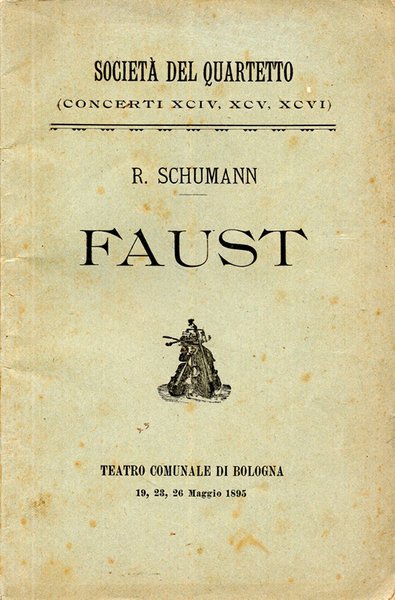 Libretto d’opera. Teatro Comunale di Bologna, 19, 23 e 26 maggio 1895. Società del Quartetto. Direttore Giuseppe Martucci. E’ il libretto della prima rappresentazioni del Faust di Schumann, in cui nel ruolo di Margherita si esibisce Maria De Macchi, grande soprano drammatico e nel ruolo di Faust Giuseppe Kaschmann, uno dei migliori baritoni del suo tempo.