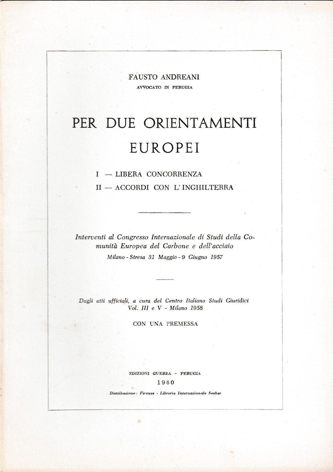 FAUSTO ANDREANI AVV. IN PERUGIA PER DUE ORIENTAMENTI EUROPEI LIBERA CONCORRENZA ACCORDI CON L'INGHILTERRA INTERVENTI AL CONGRESSO INTERNAZIONALE DI STUDI DELLA COMUNITA' EUROPEA DEL CARBONE E DELL'ACCIAIO I MILANO STRESA 31 MAGGIO 9 GIUGNO 1957 DAGLI ATTI UFFICIALI A CURA DEL CENTRO ITALIANO DI STUDI GIURIDICI VOL III E V MILANO 1958 CON PREMESSA ED. GUERRA PERUGIA 1960L 4577 COPERTINA EDITORIALE MORBIDA IN OTTIMO STATO N. PAG. 14 CM. 24 X 17