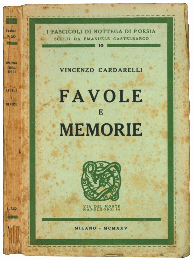 Mm. 190x124. Pp. 133, [3]. Carta lievemente ed uniformemente brunita, con lievi fioriture. Esemplare in barbe. Brossura editoriale con il logo di Bottega di Poesia disegnato da Scopinich. Presente una sovraccoperta protettiva in acetato trasparente. Presenza di fioriture diffuse alla copertina, mancanza al dorso. Prima edizione, il volume è l'esemplare nr. 297 di 525 stampati e numerati.