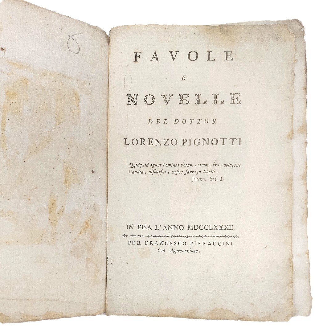 >in-8, pp. XXXVIII, 212, (2), copertina coeva in carta decorata (mancanze al dorso). Con un bel ritratto in sanguigna della duchessa Maria Isabella di Somerset inc. in rame da Franc. Bartolozzi. A lei l'autore dedica il poemetto "L'ombra di Pope" che precede le "Favole". Prima edizione di questa nota e fortunata opera del Pignotti (Figline Valdarno 1739 - Pisa 1812), che ebbe 10 edizioni fino al 1800. Bell'esemplare a pieni margini, con barbe. Gamba 2651. Passano, Novellieri ital. in verso, p. 238.