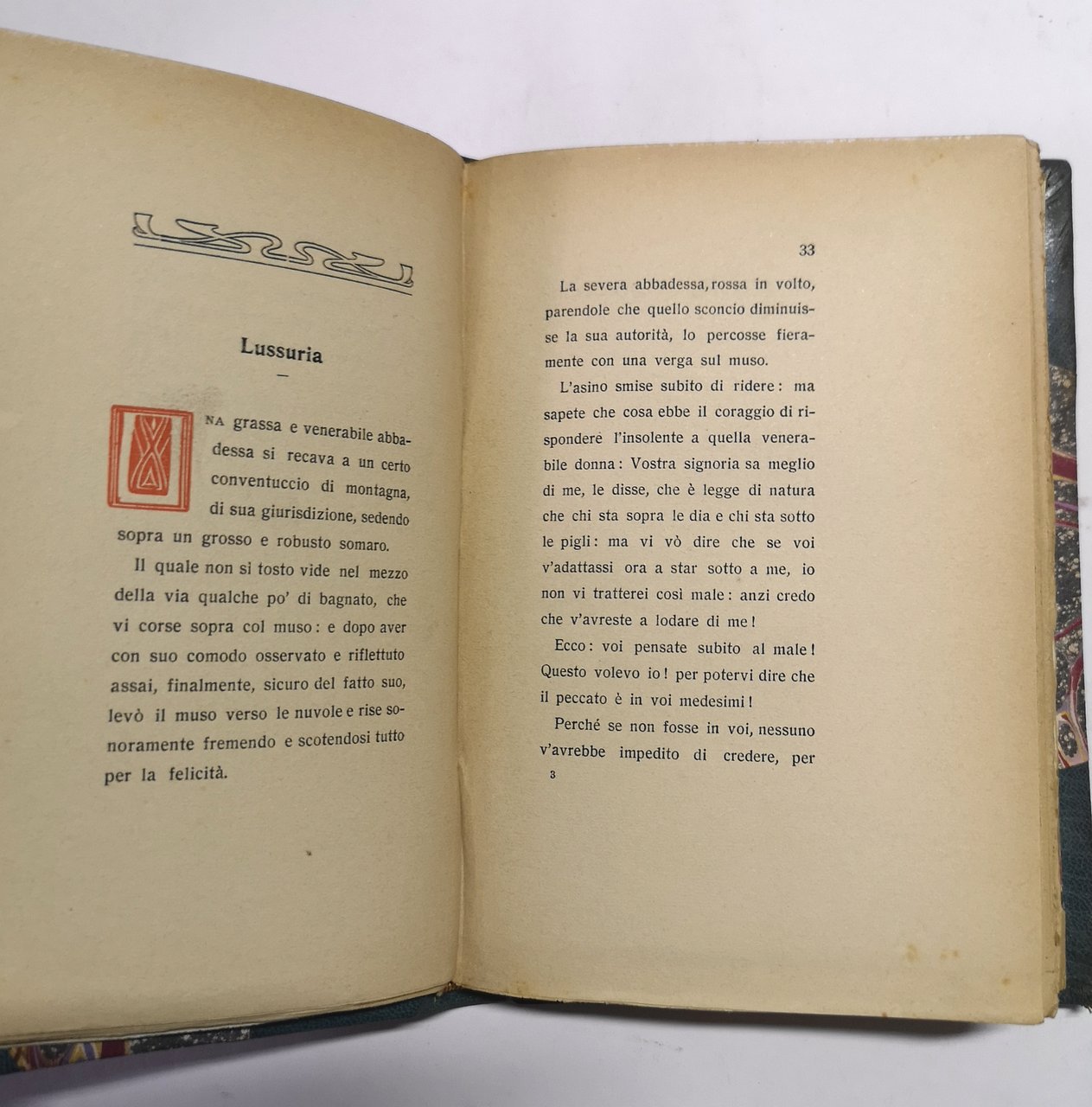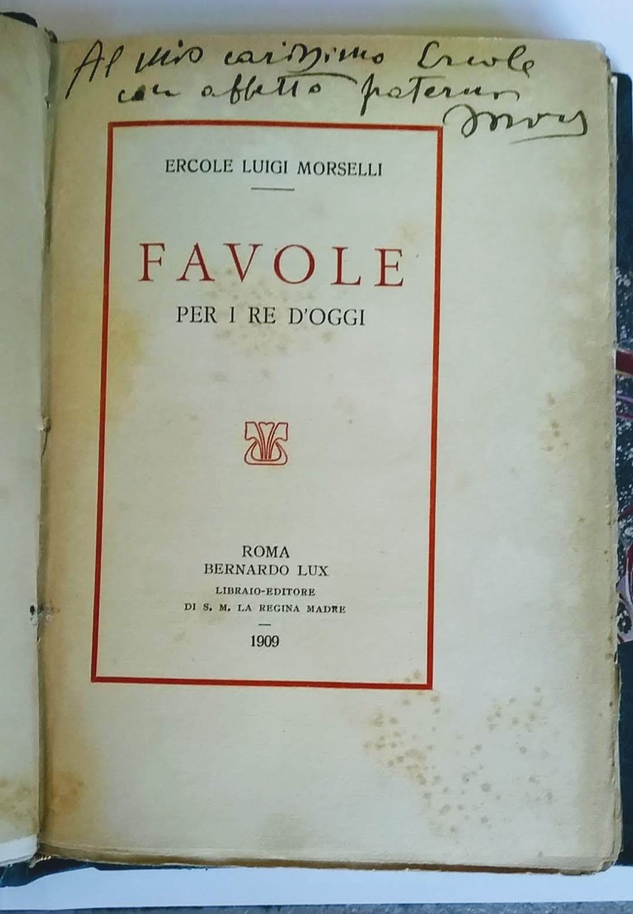 >in-16, pp. IX, 159, testo in rosso e nero, legatura d'amatore in m. marocchino e angoli, filetti in oro ai piatti, titolo in oro su dorso a nervi, taglio sup. dorato, broch. edit. figurata a colori conservata. Edizione originale, rarissima, di questa raccolta di belle prose liriche e satiriche. Ottimo esemplare, con dedica coeva ms. al frontespizio: "Al mio carissimo Ercole con affetto paterno" (firma illeggibile); usuale brunitura della carta ai margini.