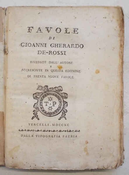 In 16° (cm. 15,5 x 11,5); pagg. XVI, 223, (1); con due marche tipografiche: T.P. al frontespizio e civetta in fine; cartonatura antica con rinforzo più recente al dorso. Esemplare molto buono, a pieni margini. VG. ** Cfr. Gorini (Settecento) pagg. 276. "Rivedute dall'Autore e accresciute in questa edizione di trenta nuove favole".