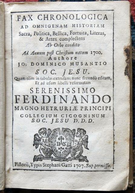Fax Chronologica ad omnigenam Historiam Sacra, Politica, Bellica, Fortuita, Literas, & Artes complectens. Ab orbe codito. Ad annum post Christum natum 1700. Autore Jo: Dominico Musantio Soc. esu. Quam olim in tabuas extensam; nunc secundò editam, et ad usum lbeli reformtam Serenesimo Ferdinando Magno Hetruriae Principi Collegium Cicogninium Soc. Jesu D. D. D.