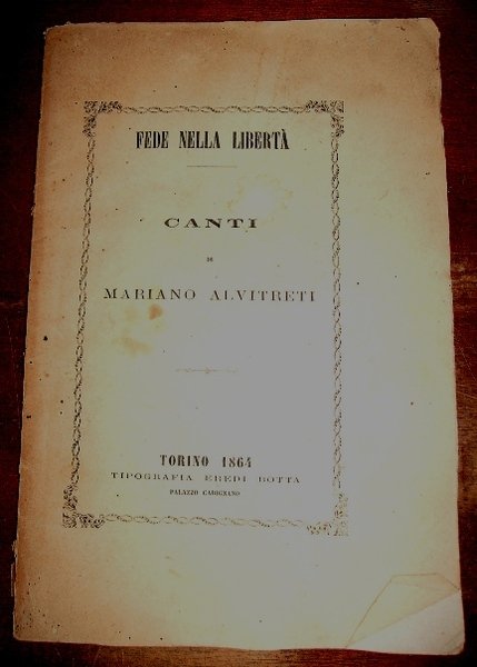 Volume in 8, brossura editoriale, titolo al piatto inquadrato da cornice ornamentale, bianca, frontespizio, prefazione, occhiello, 66 pp., bianca finale. Personaggio significativo nella letteratura risorgimentale il marchese Alvitreti di Ascoli, attivo nell'apostolato dantesco' quale societ (segreta) unificatrice di tutte le genti italiche. Qui presentiamo uno dei suoi pi patriottici canti lirici. Lieve brunitura della carta, in bello stato, assai poco comune.