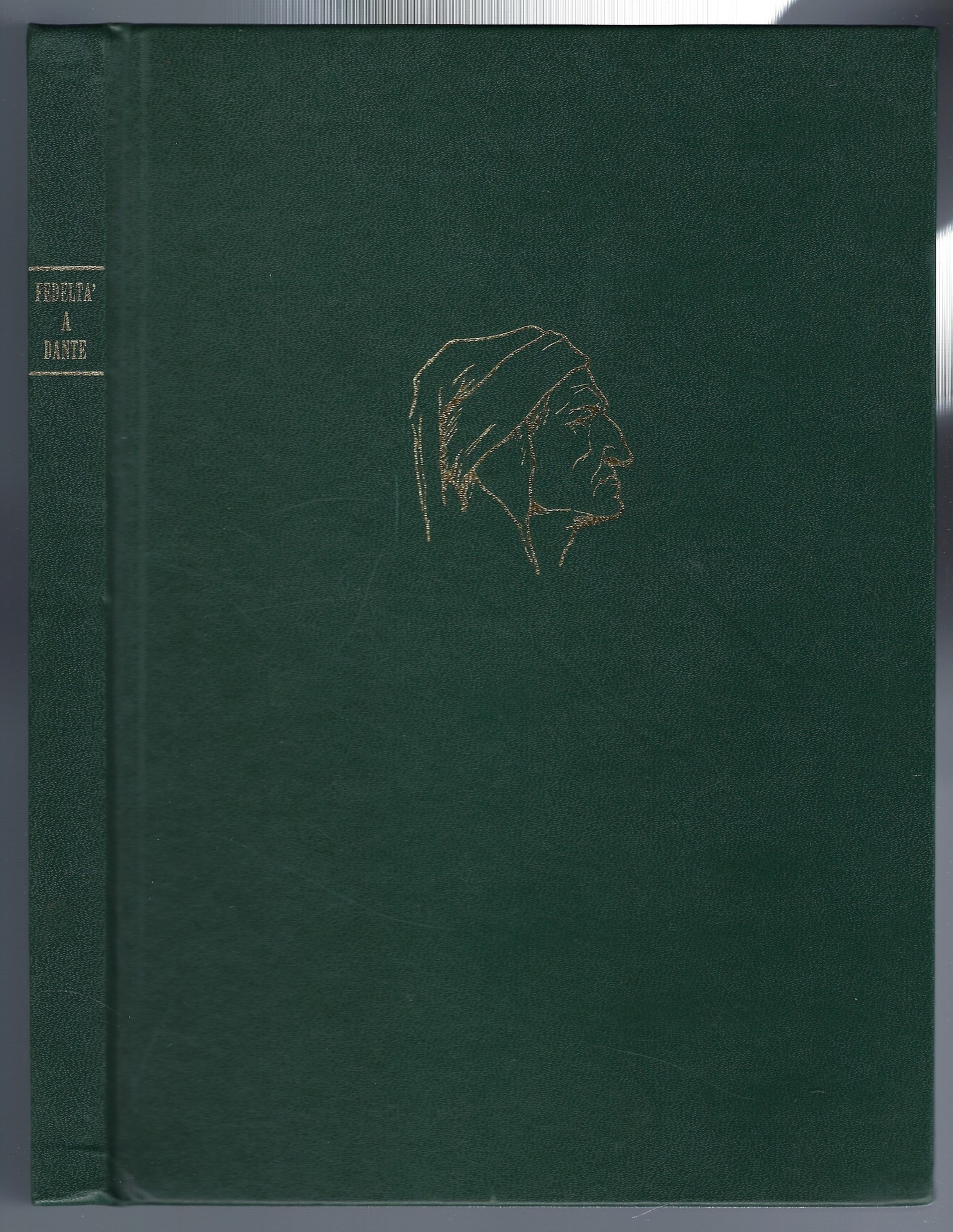 Legatura editoriale in tutta similpelle verde con titoli dorati al dorso e profilo di dante dorato al piatto anteriore.