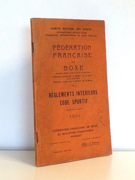 1 vol. in-12 br., Fédération Française de Boxe, Paris, 1934, 150 pp. Etat très satisfaisant (anc. trace de petite mouil. en tête sur couv. et pp. de début et fin, petite marque sur couv., bon état par ailleurs). Peu courant