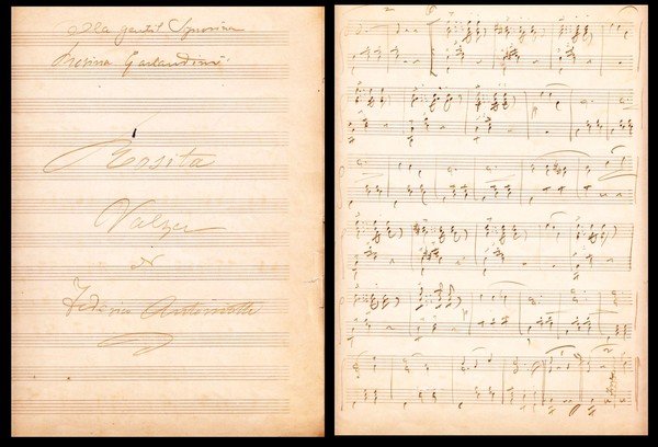 spartito musicale manoscritto di Federico Antoniotti di 6 pp. di cui 4 con le note a matita inviato alla casa editrice milanese di spartiti musicali Monzino & Garlandini (precisamente a Rosina Garlandini); buon es.