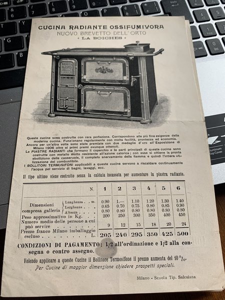 Plaquette, pp.2, cm. 22x14. Con 2 illustrazioni fra cui la "Cucina radiante ossifumivora. Nuovo brevetto Dell'Orto" e relativi prezzi. All'interno alcuni schizzi a penna.