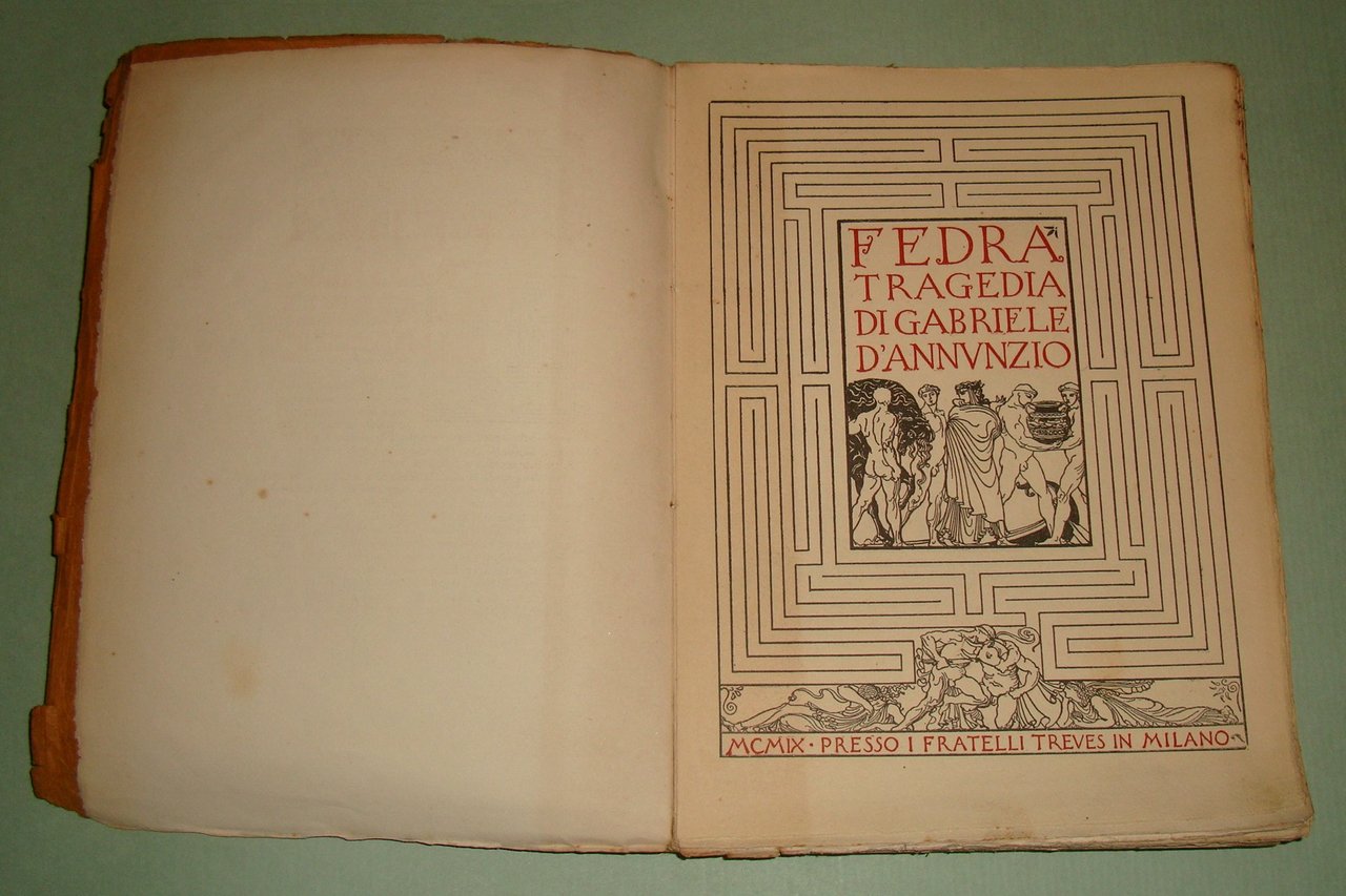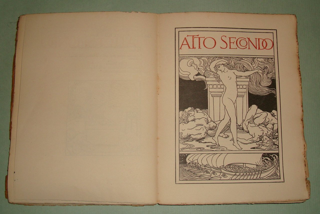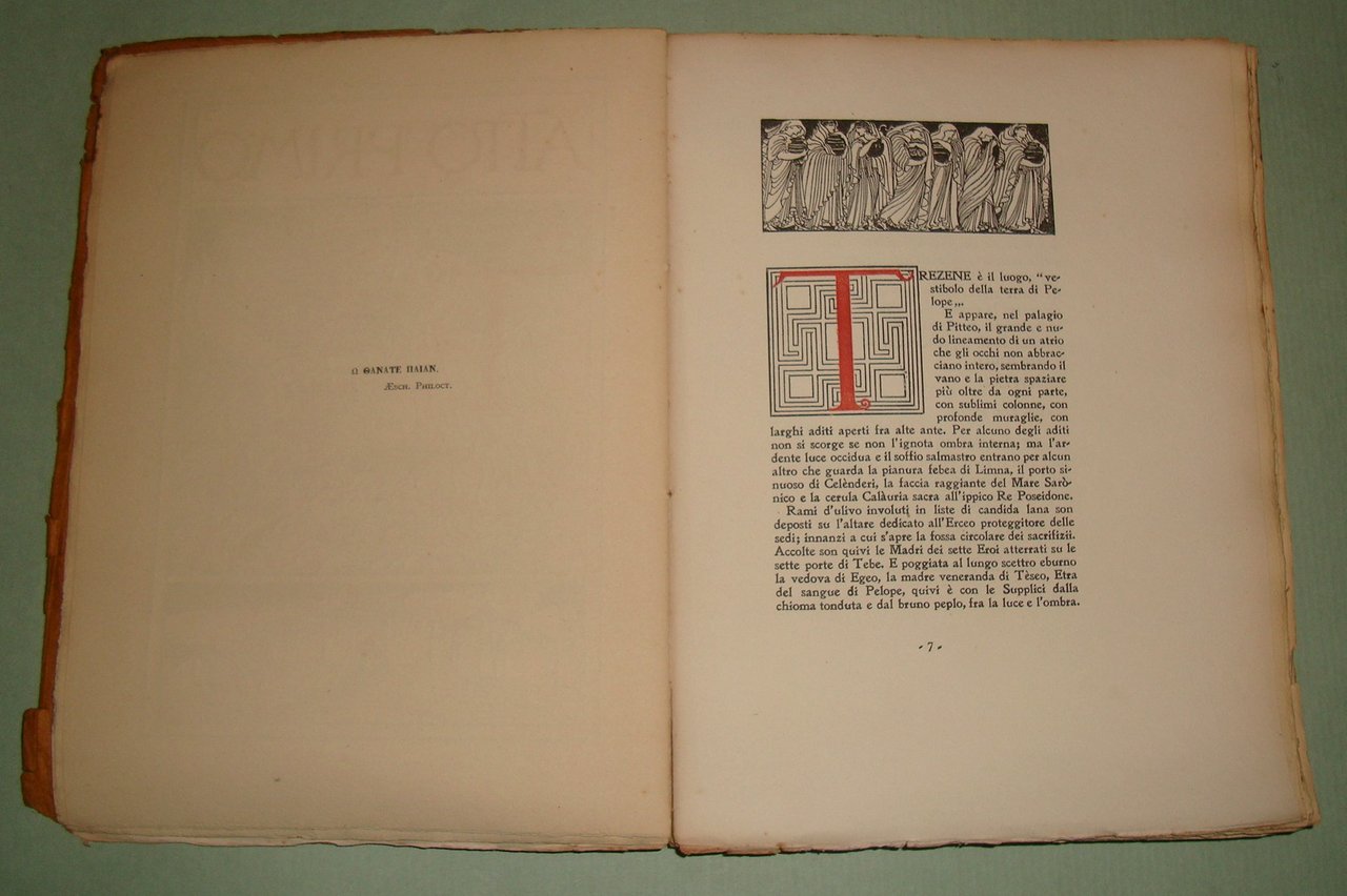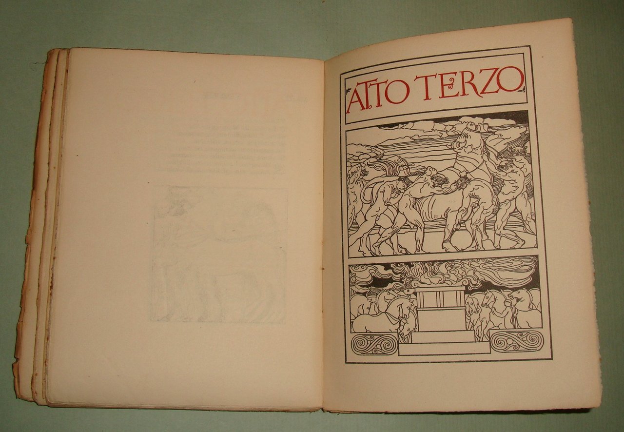 Milano, Fratelli Treves, 1909. In 8vo; pp. 215, 5 n.nn. Copertine avana, illustrazione in nero al piatto anteriore, al verso una lira romana. Esemplare slegato. Frontespizio con figure greche inquadrate da un fregio in nero, caratteri in rosso. Cinque silografie a piena pagina. Sei vignette distribuite una al principio ed una alla fine di ciascun atto. Capilettera in nero e rosso. Le illustrazioni di Adolfo De Carolis. Pubblicata il 10 aprile 1909, la sera stessa della prima rappresentazione. Edizione originale. De Medici, 69.