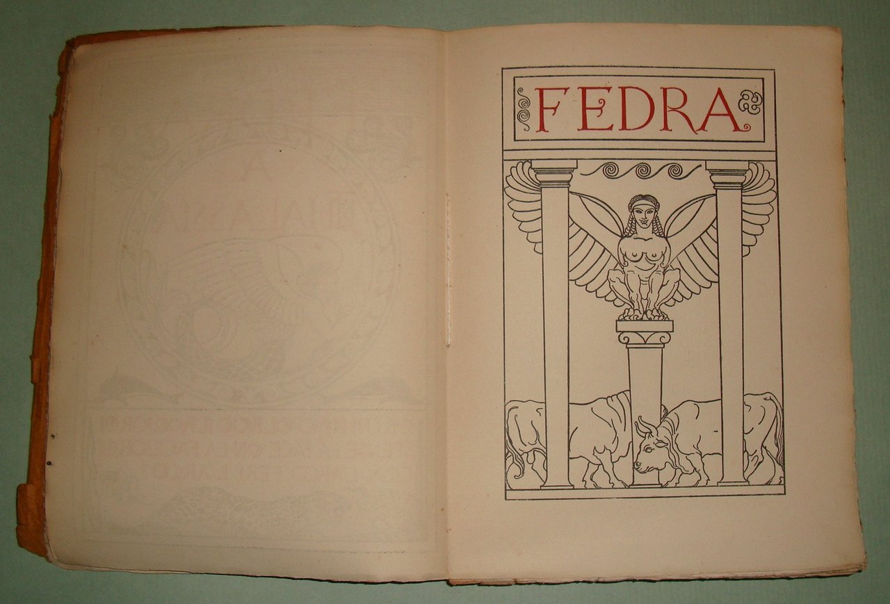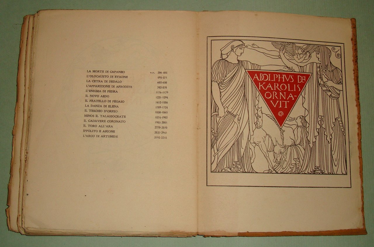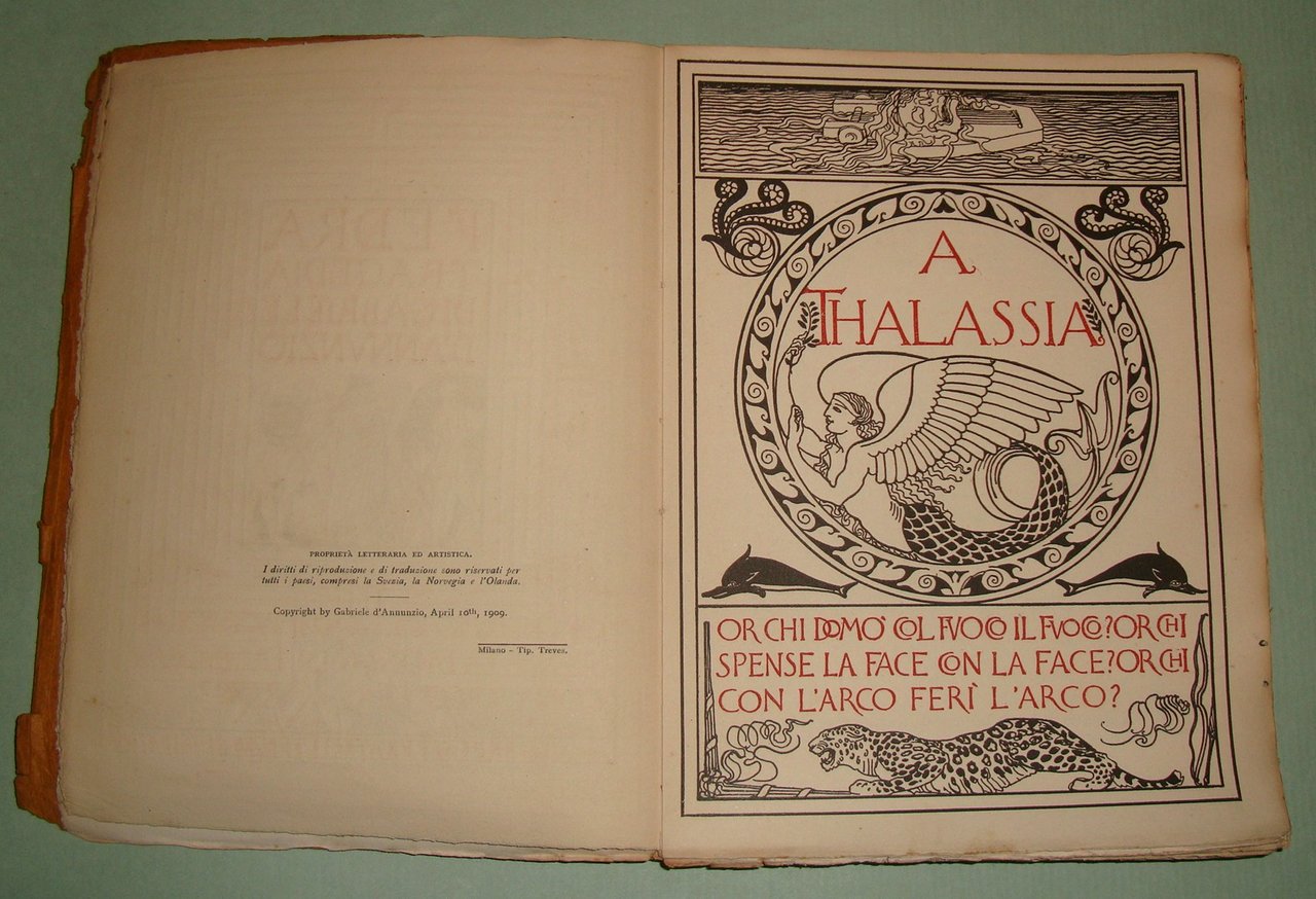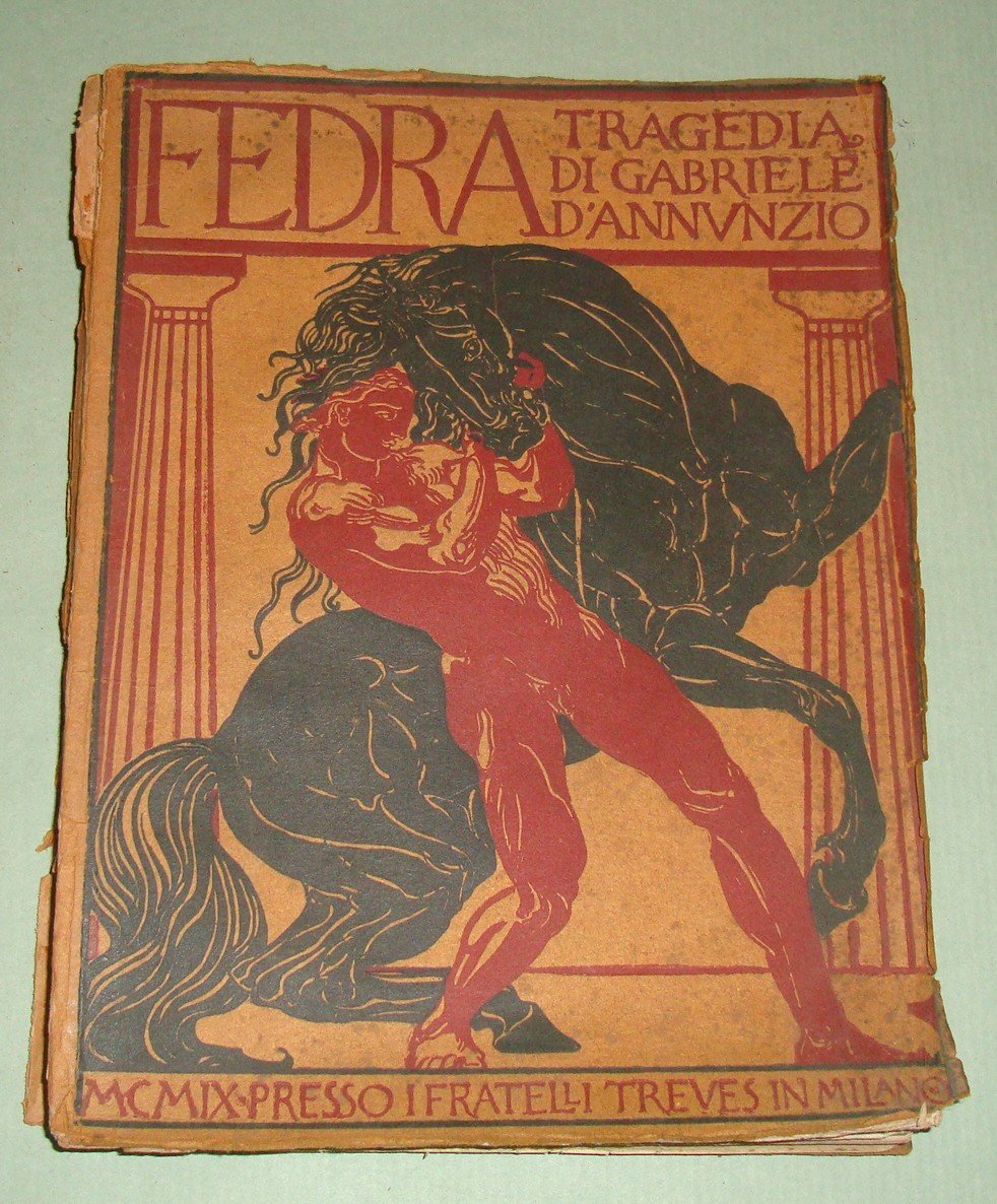 Milano, Fratelli Treves, 1909. In 8vo; pp. 215, 5 n.nn. Copertine avana, illustrazione in nero al piatto anteriore, al verso una lira romana. Esemplare slegato. Frontespizio con figure greche inquadrate da un fregio in nero, caratteri in rosso. Cinque silografie a piena pagina. Sei vignette distribuite una al principio ed una alla fine di ciascun atto. Capilettera in nero e rosso. Le illustrazioni di Adolfo De Carolis. Pubblicata il 10 aprile 1909, la sera stessa della prima rappresentazione. Edizione originale. De Medici, 69.
