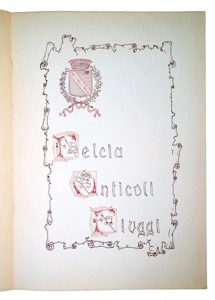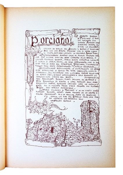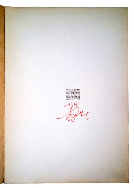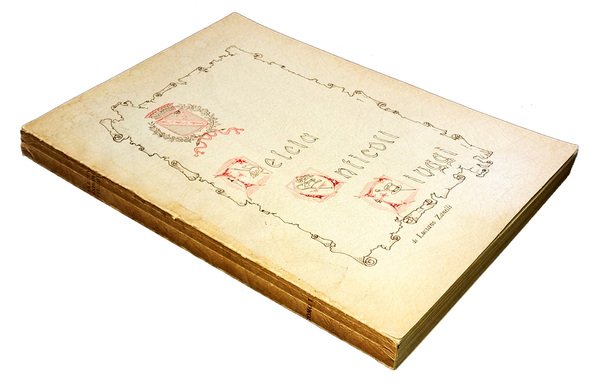 in-4°, 300x214 mm, legatura in brossura editoriale, titolo calligrafato al piatto anteriore entro cornice con stemma e capilettera in rosso e seppia, titolo ripetuto al dorso; [115] c.; elegante edizione stampata in litografia ad uso manoscritto, entro cartiglio in colore seppia, con numerose illustrazioni nel testo, il tutto stampato solo al recto in colore seppia. Opera a tiratura limitata (copia n. 1315), numerata e siglata dall'Autore alla prima guardia libera. Rif.: IT\ICCU\RMS\0096492 (3 copie). OCLC, 878483135. Cond.: Lievi segni d'uso (bruniture al dorso e piccole macchie). Margine delle carte leggermente ingiallito. Esemplare in condizioni generali molto buone.