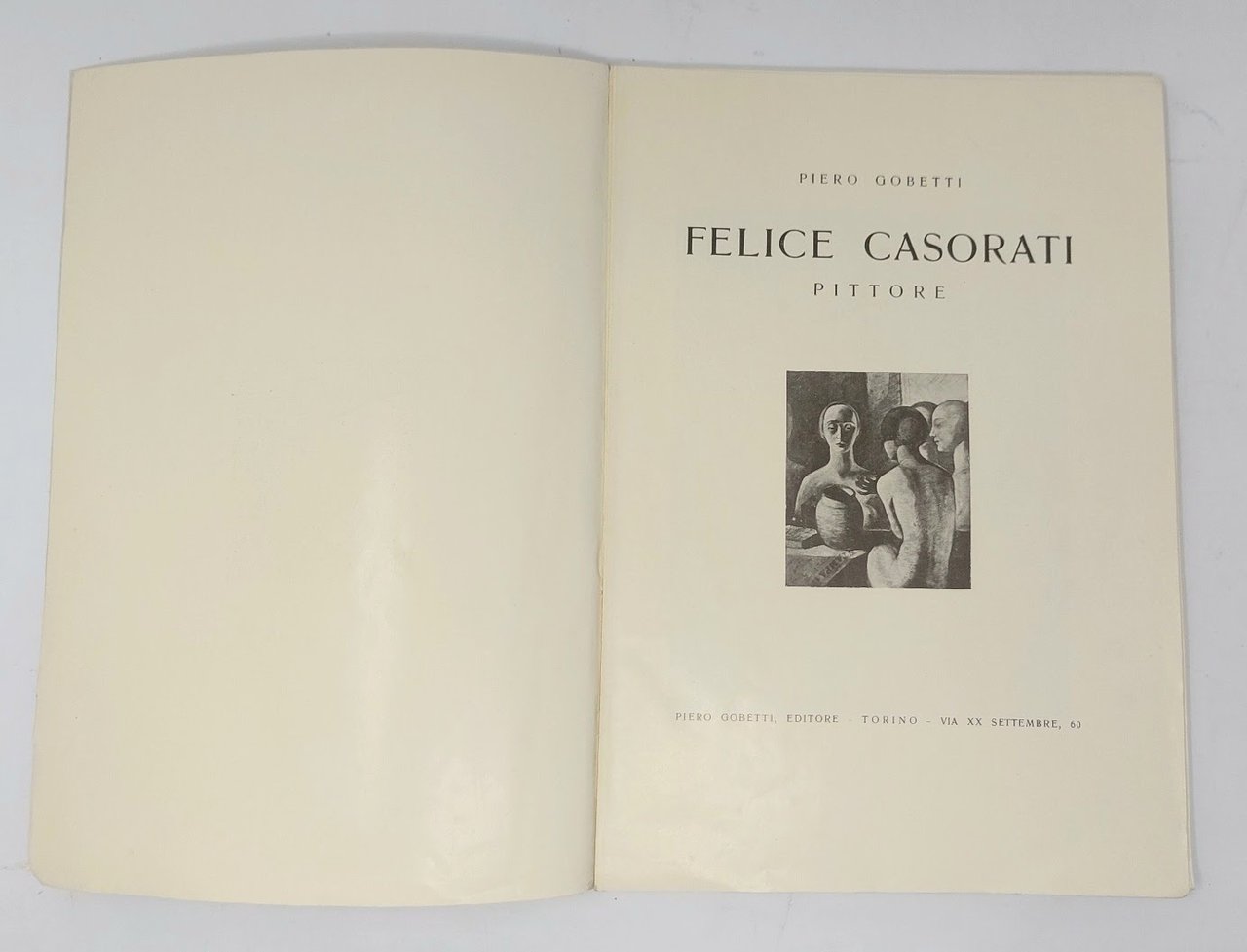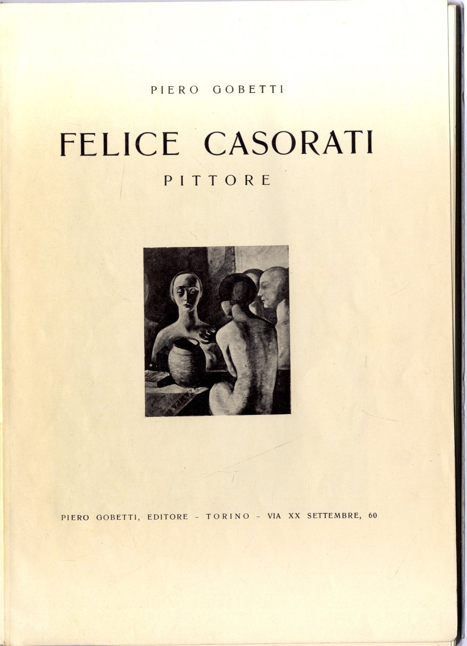 >in-8 (270x190 mm), pp. 106, copertina editoriale, dorso rifatto. Edizione originale, illustrata con 50 riproduzioni fotografiche di dipinti n.t. Volume che accomuna due straordinarie personalità della Torino fra le due guerre. E' la prima monografia artistica sul pittore Casorati (Novara 1883-Torino 1963), allora quarantenne e non ancora assurto a grande fama, scritta con felice intuito dal ventiduenne Gobetti e pubblicata dalla casa editrice da lui fondata e diretta nella sua breve vita, prima che venisse soppressa dal fascismo. Prima biografia su Felice Casorati, assai importante e rara.