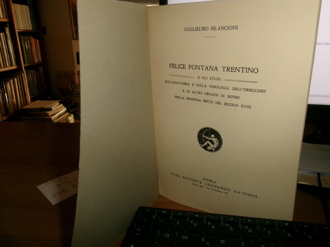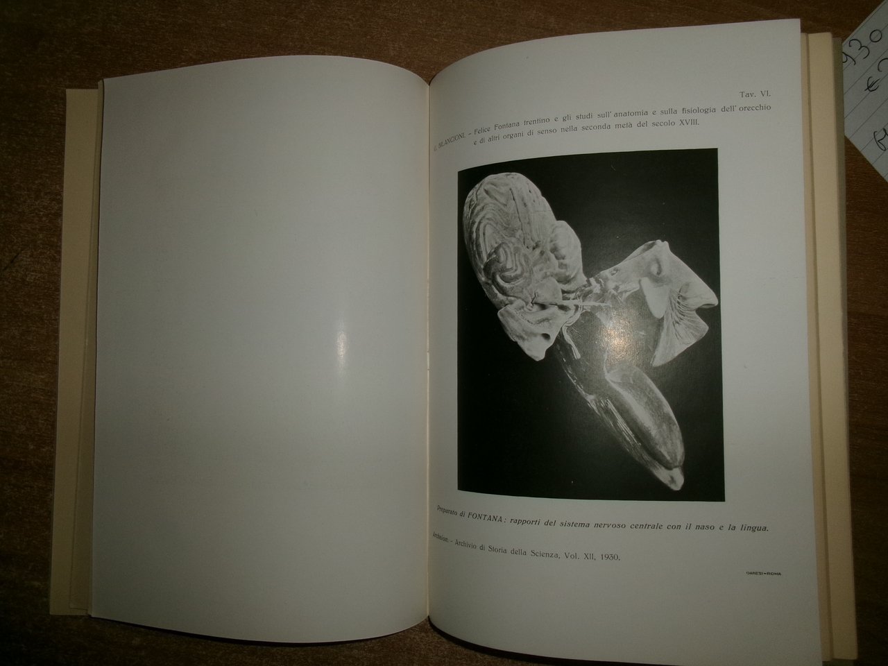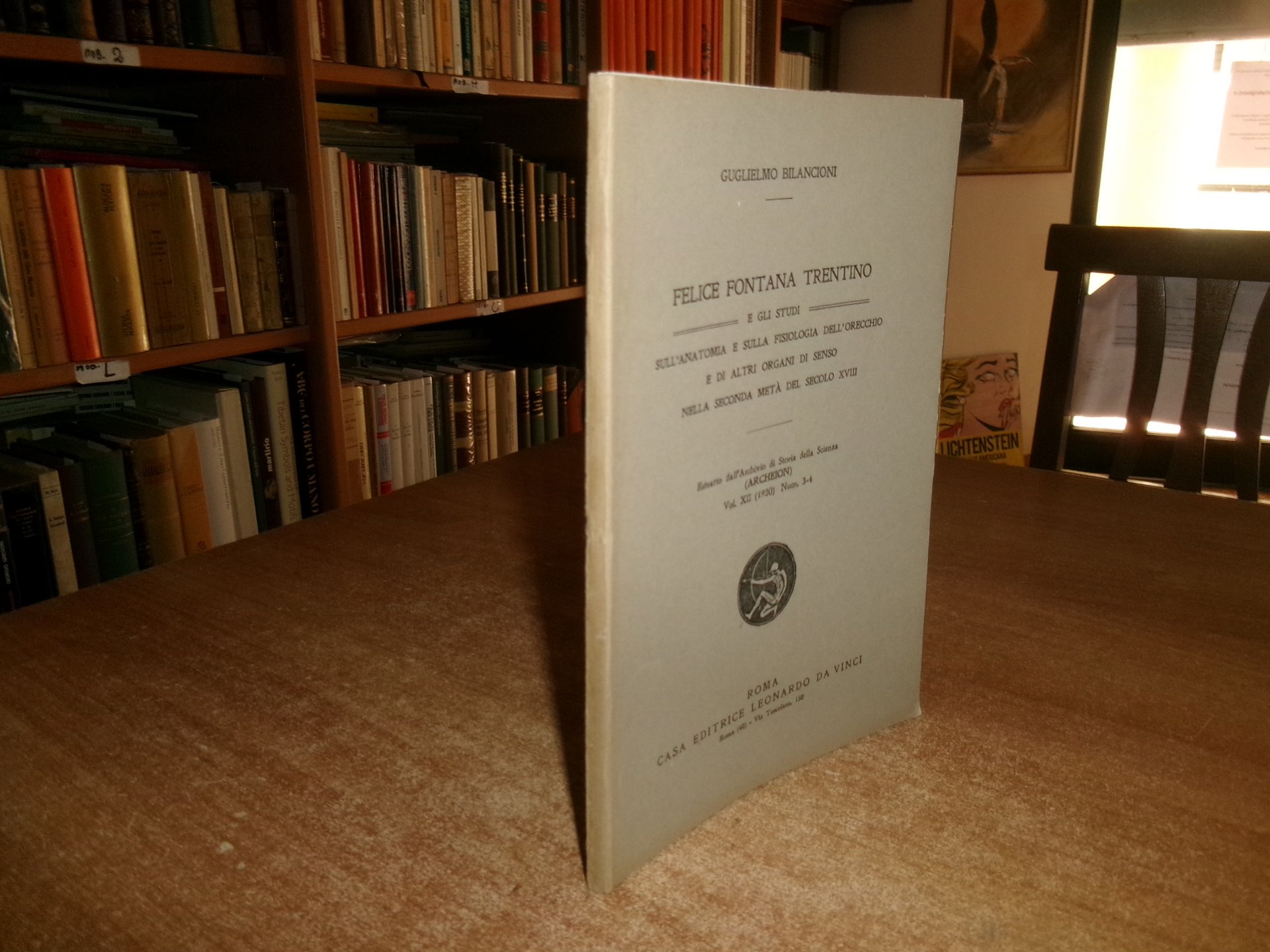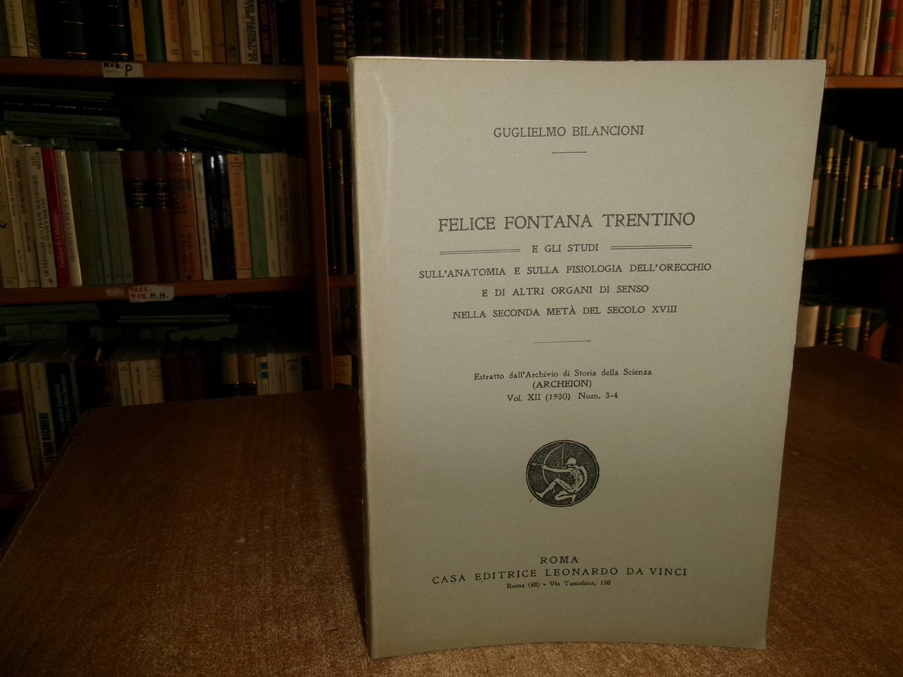 GUGLIELMO BILANCIONI. Roma, Casa Editrice Leonardo da Vinci, 1930. FELICE FONTANA TRENTINO e gli studi sull' Anatomia e sulla Fisiologia dell' orecchio e di altri organi di senso nella seconda metà del secolo XVIII. Estratto dall' Archivio di Storia della Scienza... In-8°, br. 70 pp. con VI tavole f.t. Ottimo stato. Neg. Mob. N entro busta